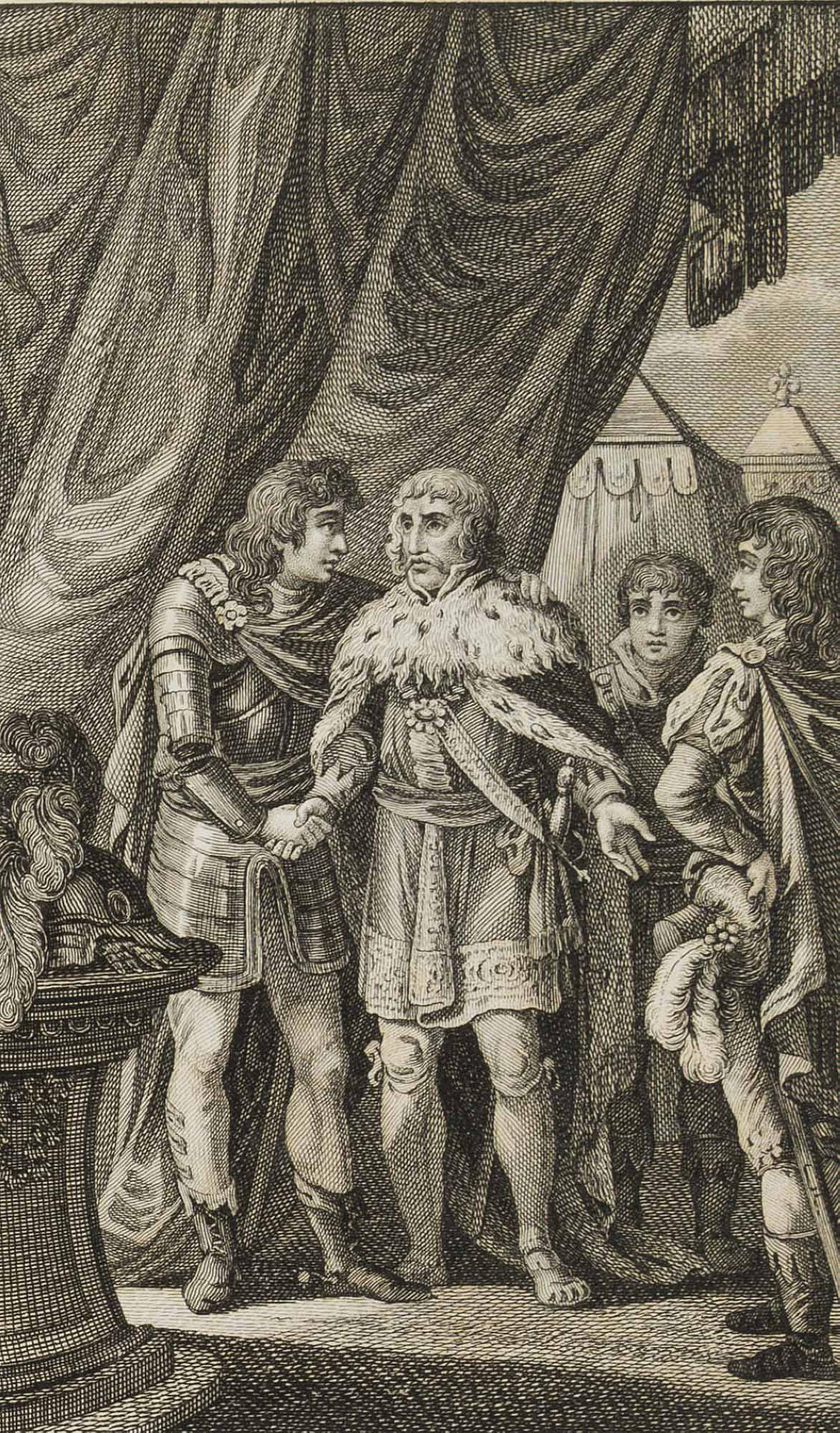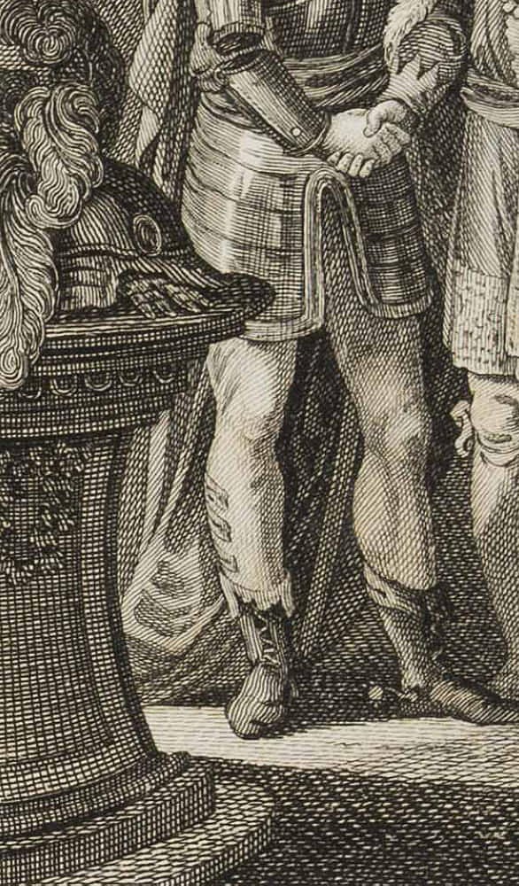 • Beschreibung: In einem Zelt in einem Feldlager kommen vier Männer zur Lagebesprechung zusammen. Der junge Ritter links spricht dem älteren Mann im Hermelinumhang, wahrscheinlich der Herrführer, gut zu. Vertraulich hält er die Hand und Schulter des Herrführers fest.