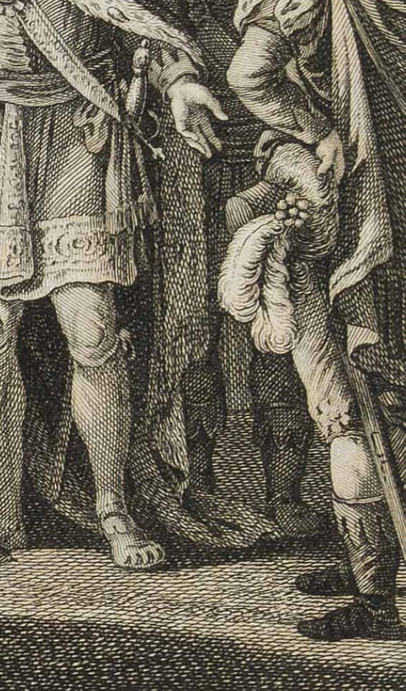 • Description: In a tent in a field camp, four men come together to discuss the situation. The young knight on the left speaks well to the older man in the ermine cape, probably the Herrführer. Confidentially, he holds the hand and shoulder of the Herrführer.