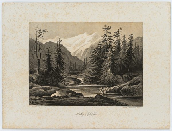 - Beschreibung: Lithographie(?) von zwei Platten, nach Bezeichnung “Tipografischer Druck mit zwei Platten” auf Papier. Österreichische Landschaftsidylle in einem Tal mit ruhig plätscherndem Flusslauf. In der ferne sind die schneebedeckten Gipfel des alpinen Gebirges zu sehen, wo sich der Stubaier Gletscher befindet.