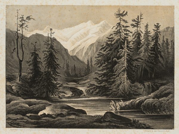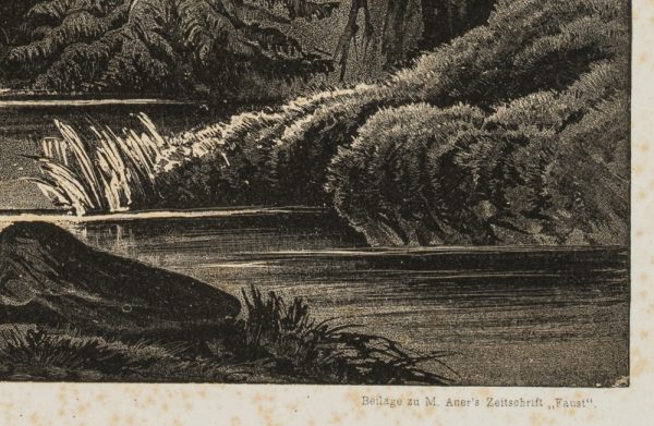 - Inscription: Signed and dated unrecognisably by the artist in the lower right corner of the printing plate. Inscribed below: “Tipografischer Druck mit zwei Platten nach Exter’s Privilegium | Beilage zu M. Auer’s Zeitschrift ‘Faust’ | Stubay-Gletscher”.