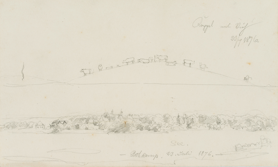 - Description: Sketch sheet in two parts by an unknown artist. The upper depiction shows a hill on which a herd of cattle has gathered. It is inscribed “Koppel mit Vieh” and dated “23/4 1876”. The lower depiction shows a sketchy panorama with a lake, greenery on the shore and individual houses.