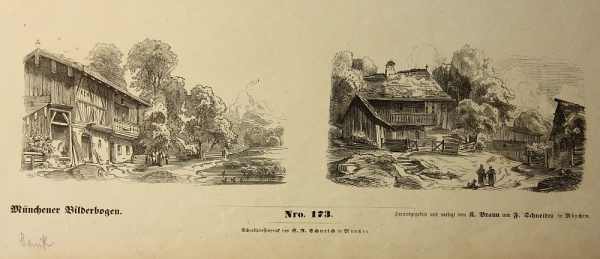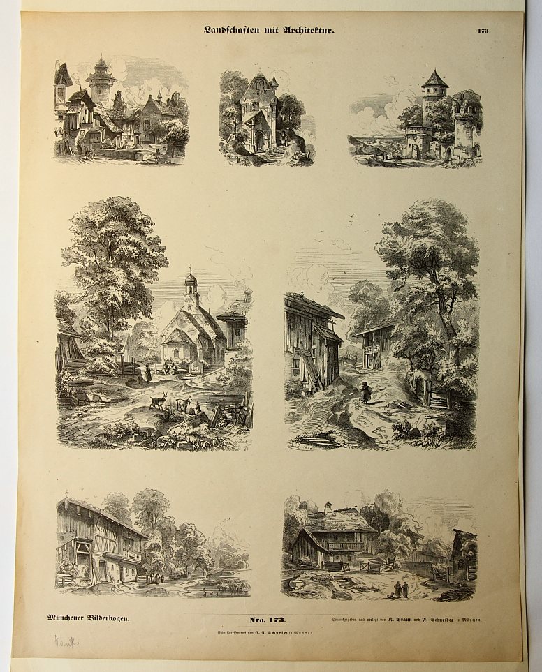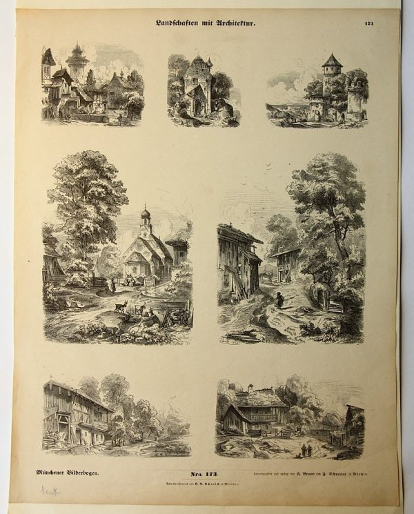- Description: Each engraving is signed in the block by the same artist “Jovak”?, “Jank”? The middle two prints are additionally dated 1856 in the printing block…. Münchener Bilderbogen No.173, Landscapes and Architecture of Southern Germany