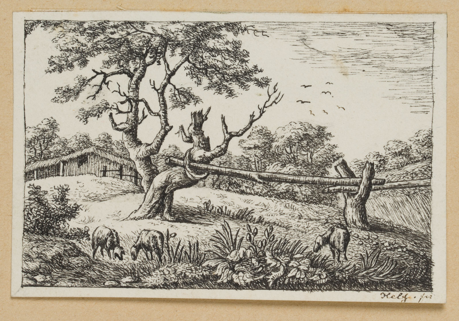 Unbekannt (19. Jahrhundert), Landschaftsdarstellung mit einem alten Baum, dem Teile des Stammes abgebrochen sind, daneben grasende Schafe und eine Holzhütte im Hintergrund, um 1830, Federlithographie