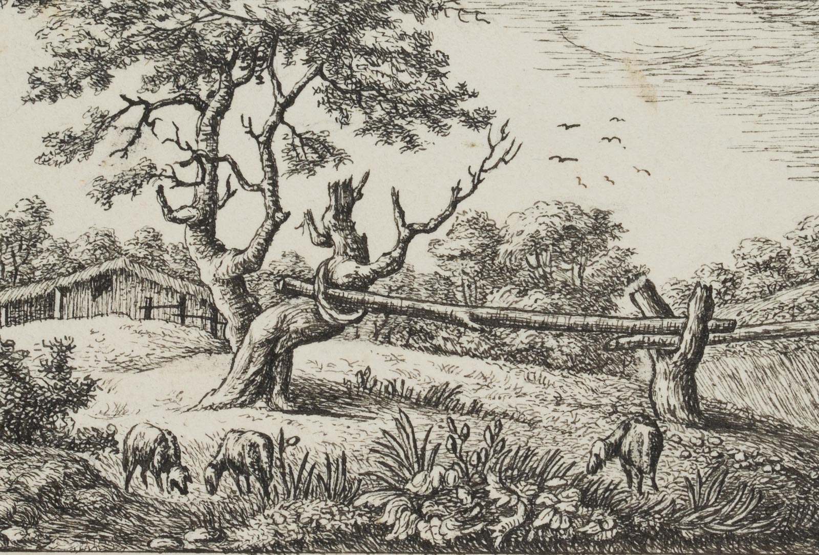 Unknown (19th century), Landscape depiction with an old tree, parts of the trunk broken off, next to it grazing sheep and a wooden hut in the background, c. 1830, Lithography with pen