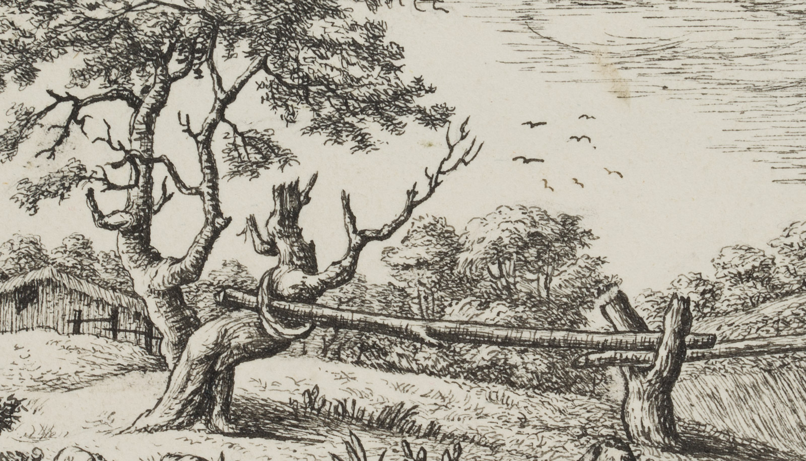 Dem Baum in der Mitte der Darstellung ist ein Teil des Stammes abgebrochen. Zusammen mit dem Baumstumpf rechts daneben bildet der nun quer liegende abgebrochene Baumstumpf einen Zaun.