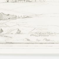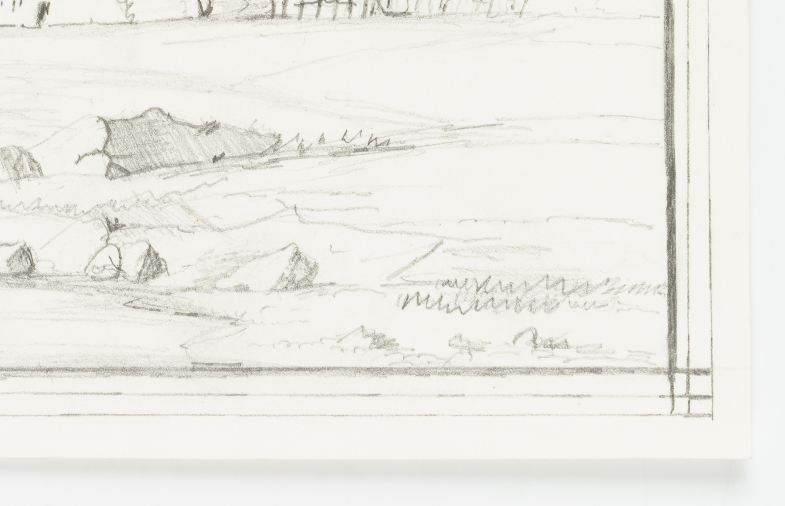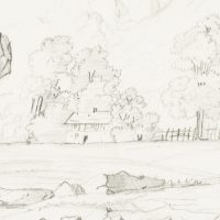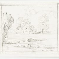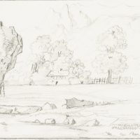 Unknown (19th century), Landscape sketch View over river to house on mountain slope, drawing, 19th century, Pencil