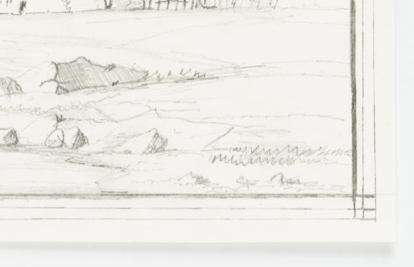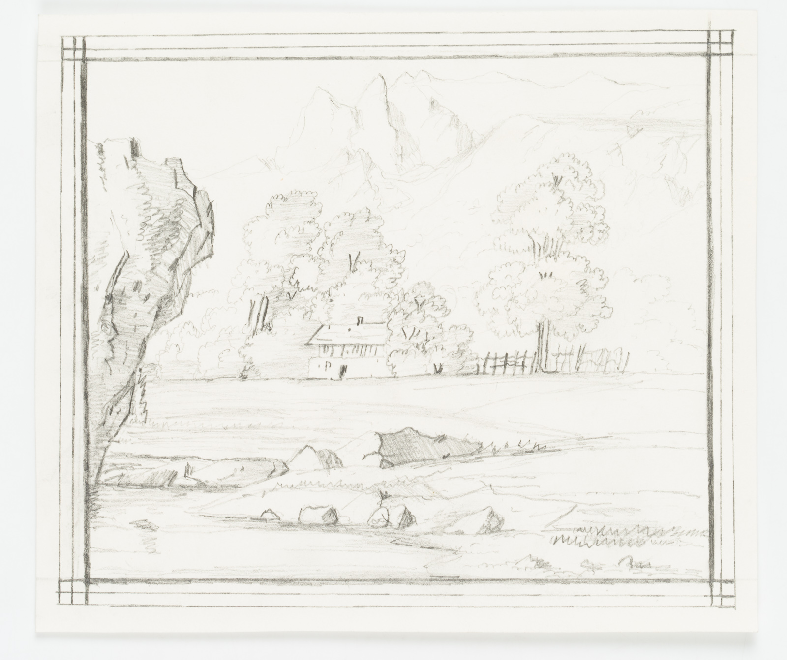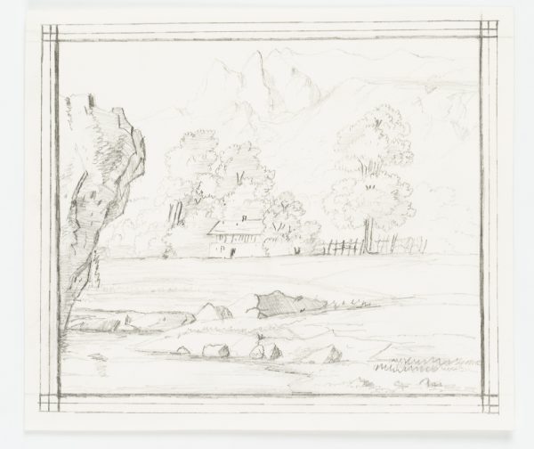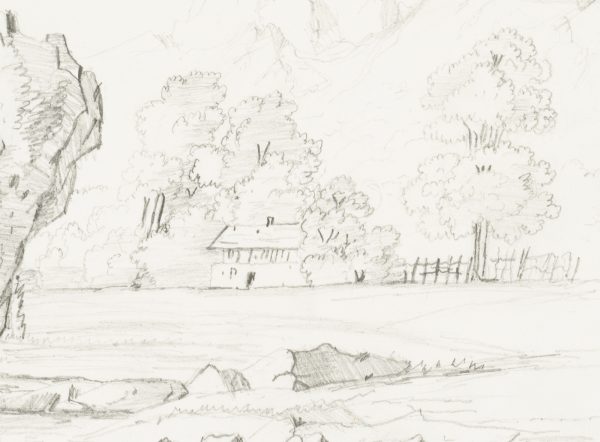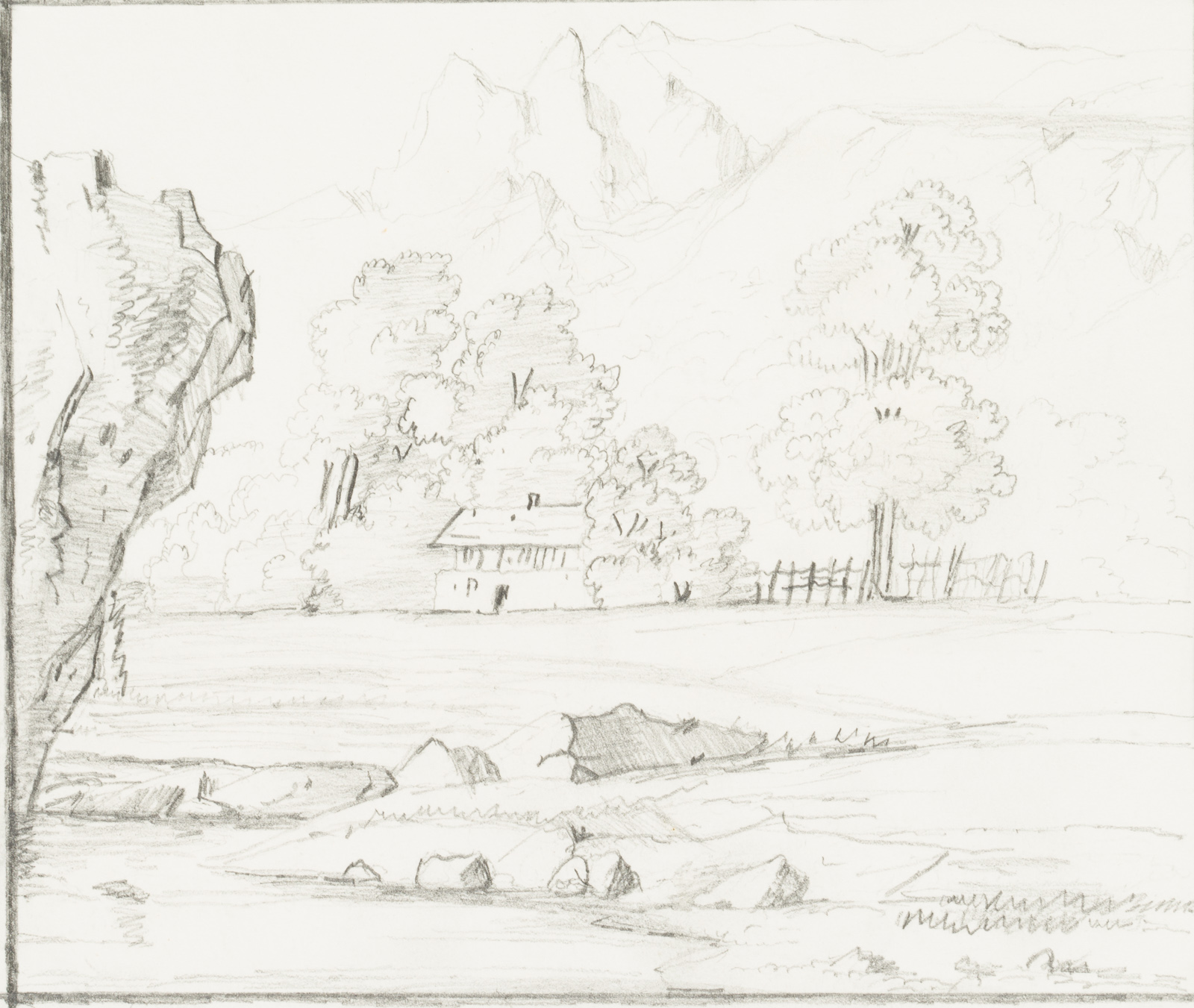 Unbekannt (19. Jahrhundert), Landschaftsskizze. Blick über Fluss auf Haus am Gebirgshang., Zeichnung, 19. Jahrhundert, Bleistift