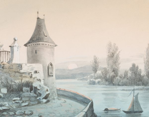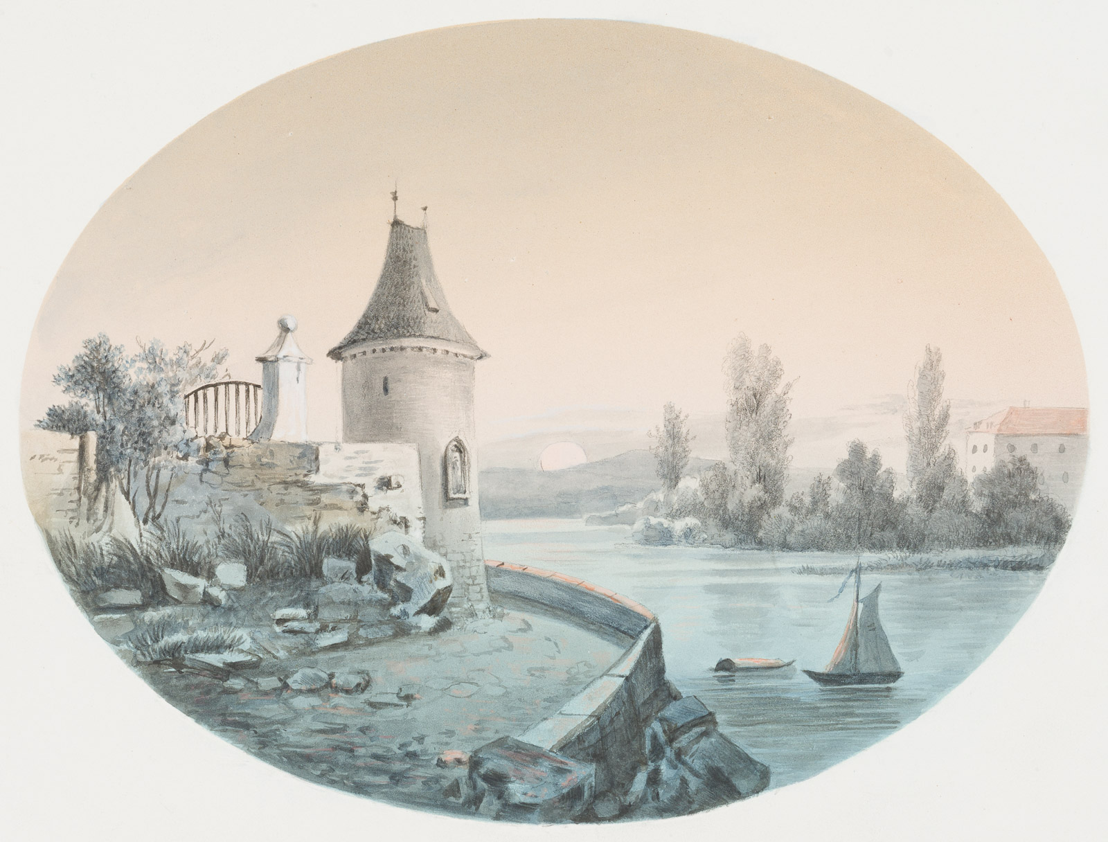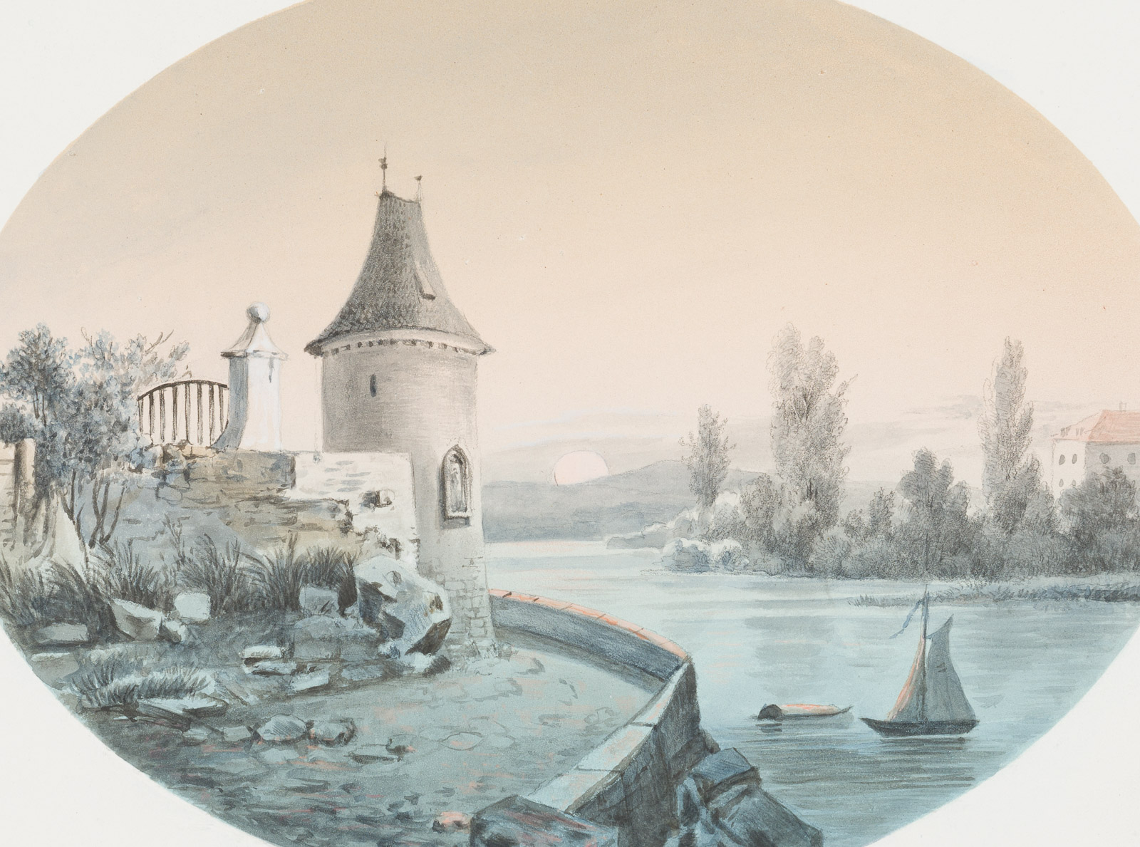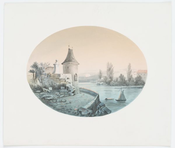 Unknown (19th century), Landscape Veduta with Tower on the River and Sailing Boat, c 1844, c. 1844, Watercolor