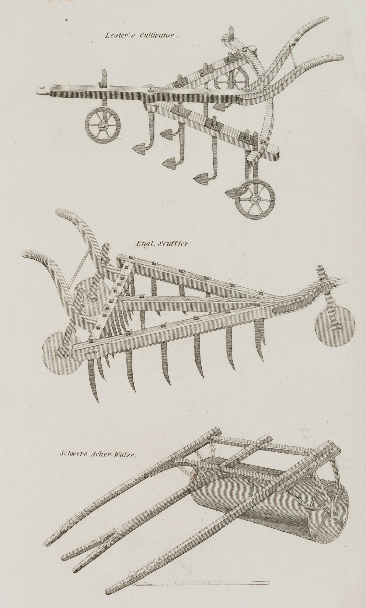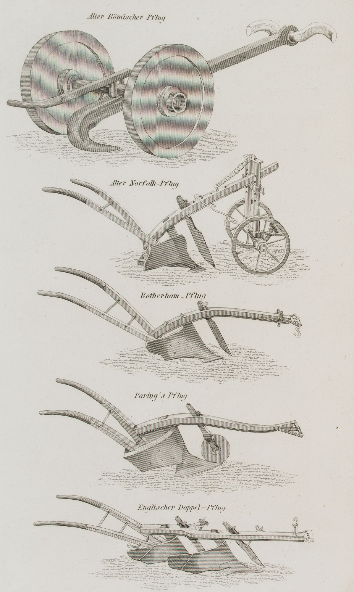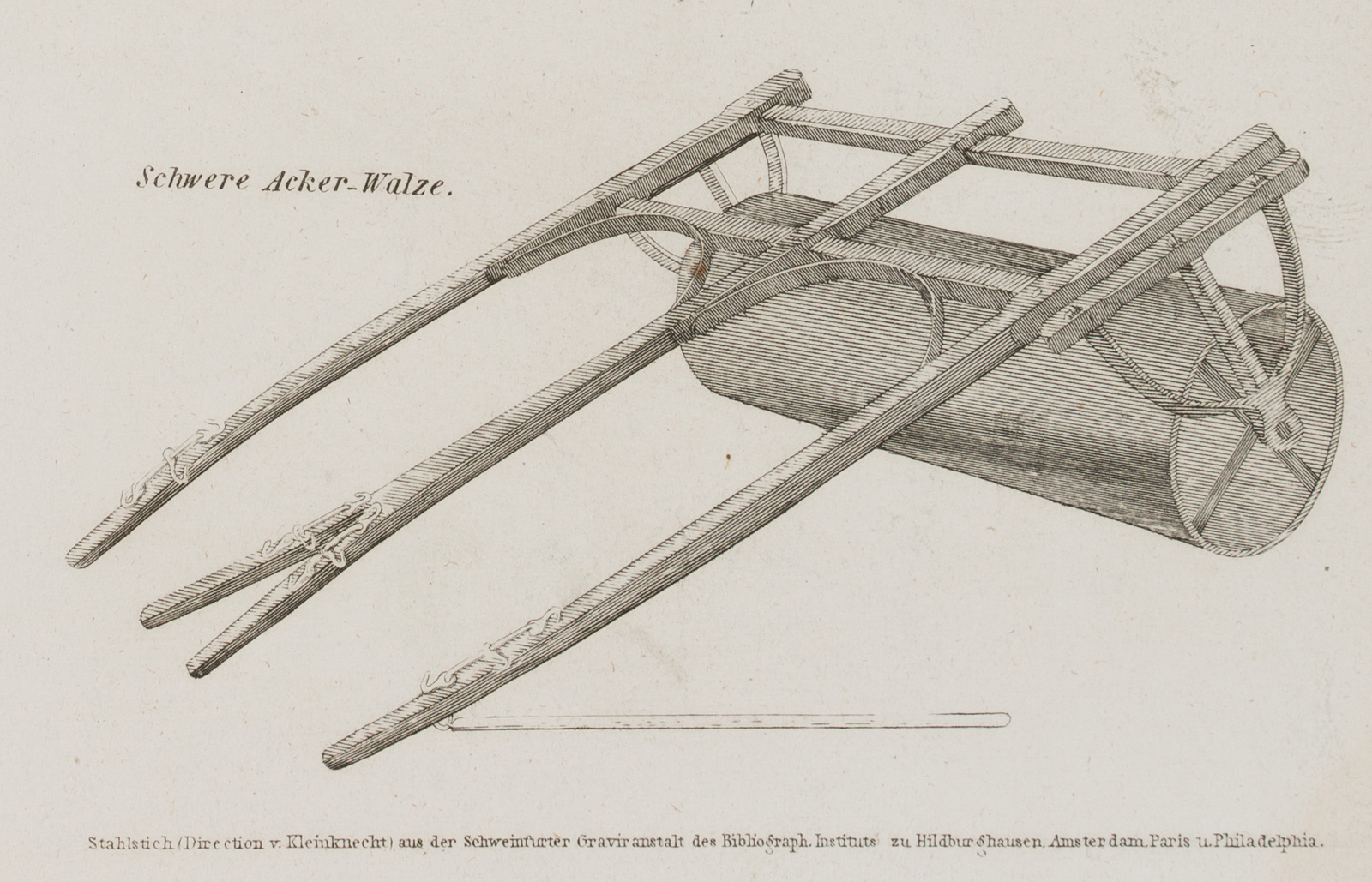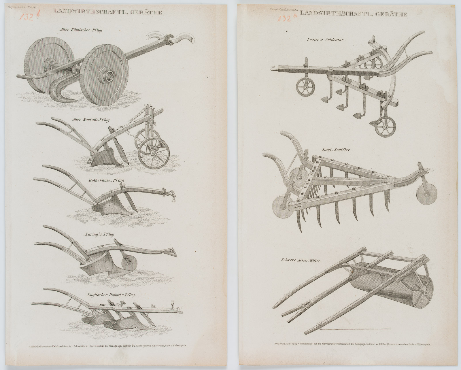 - Description: Two leaves, from: Meyer’s Conv. Lex. N. 132 a and b. Above the illustration titled “Landwirtschaftl. Geräthe”, below: “Stahlstich (Direction von Kleinknecht) aus der Schweinfurter Graviranstalt des Bibliograph. Institut zu Hildburghausen, Amsterdam, Paris u. Philadelphia.” One sheet shows four different ploughs: “Old Roman Plough”, “Norfolk Plough”. “Rotherham Plough”, “Paring’s Plough”, “English Double Plough”, the other sheet shows “Lester’s Cultivator”, “Engl. Scuffler” and “Heavy Field Roller”.