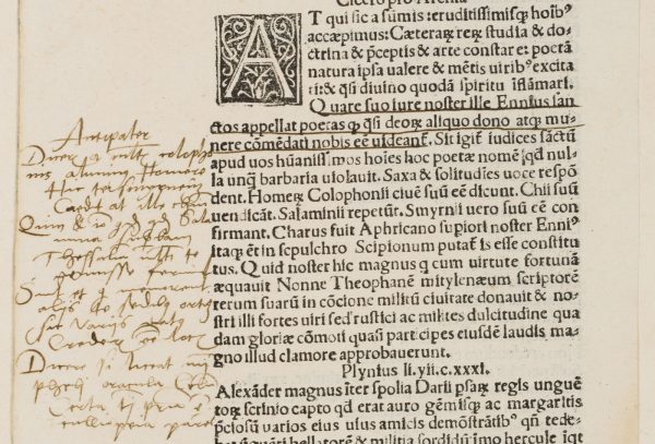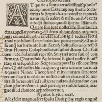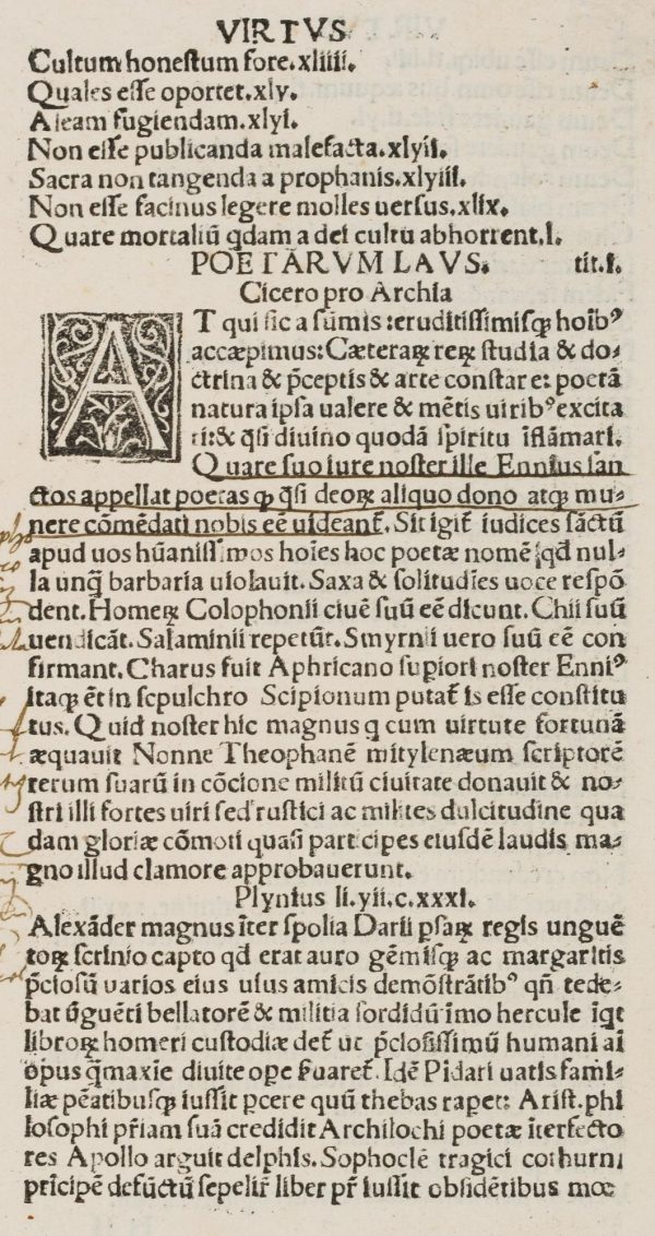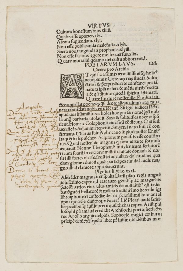 Unbekannt (19. Jahrhundert), Lateinische Textseite mit der Überschrift ‘Virtus und einer Themenübersicht, im Fließtext werden bekannte antike Persönlichkeiten wie Alexander der Große, Homer, Plinius, Cicero genannt, 19. Jahrhundert, Reproduktion