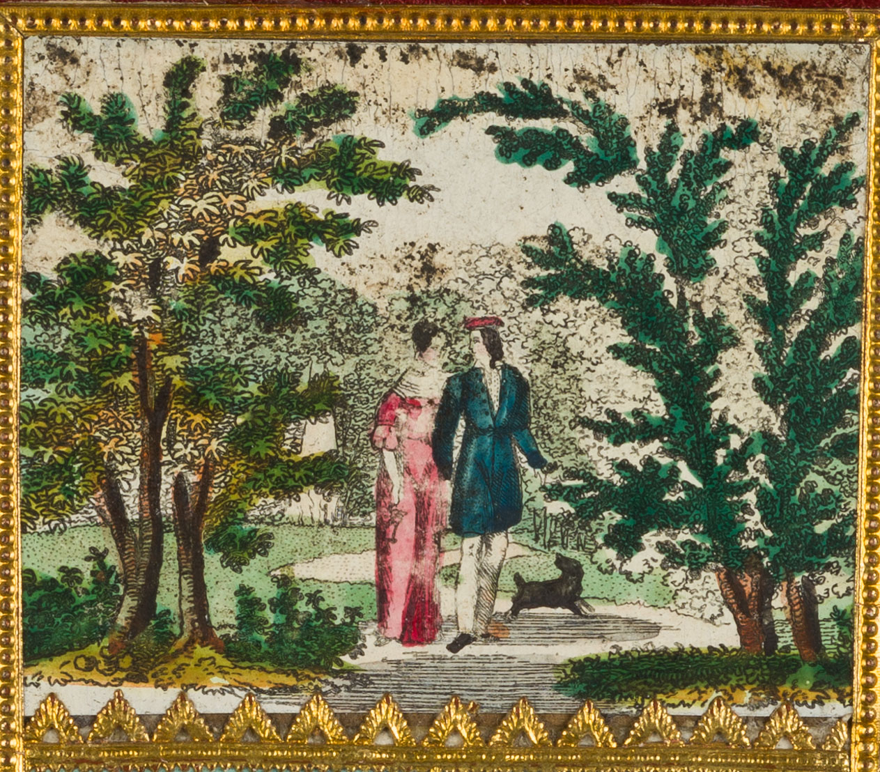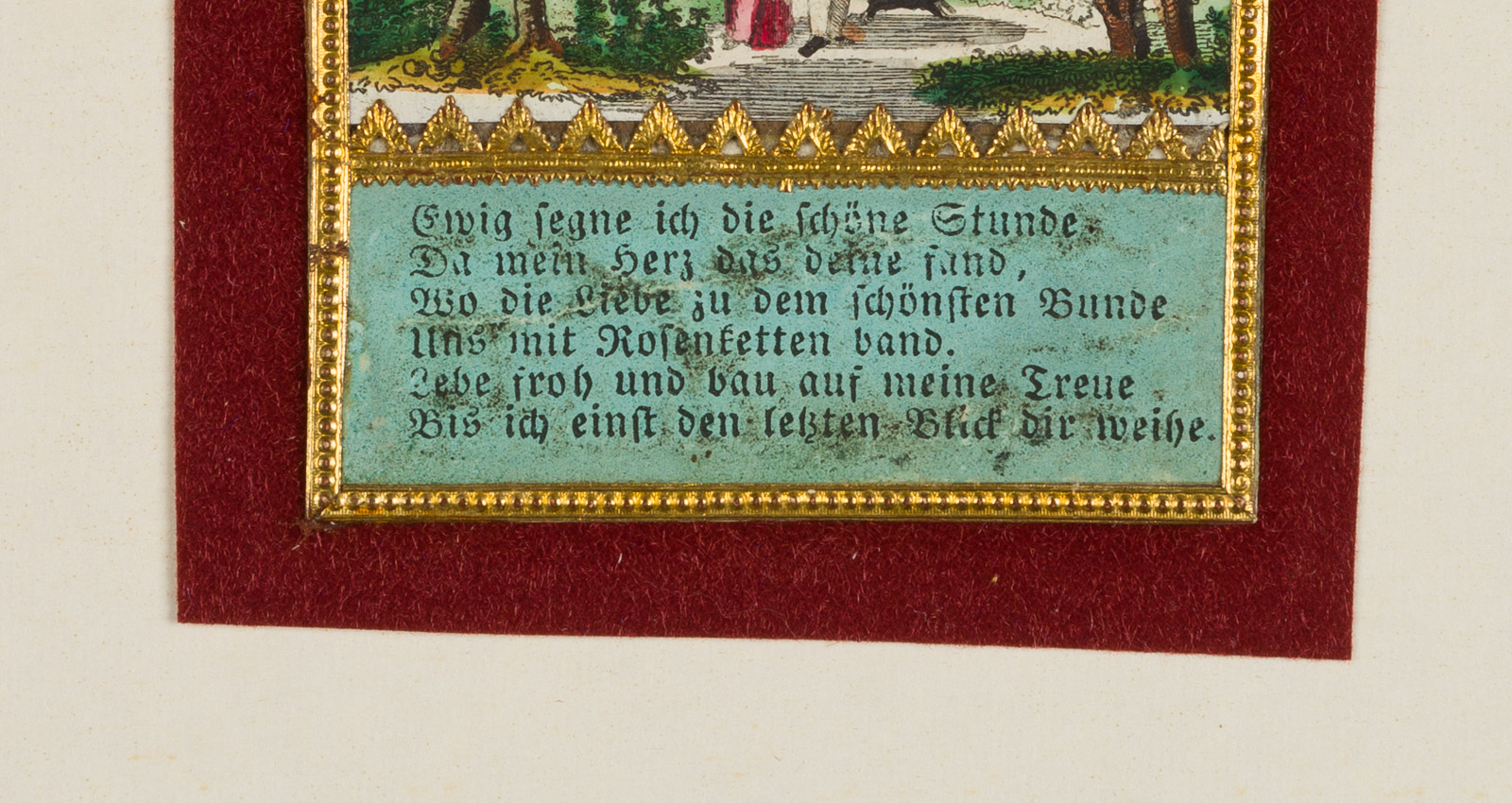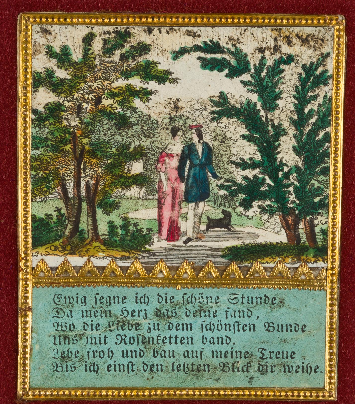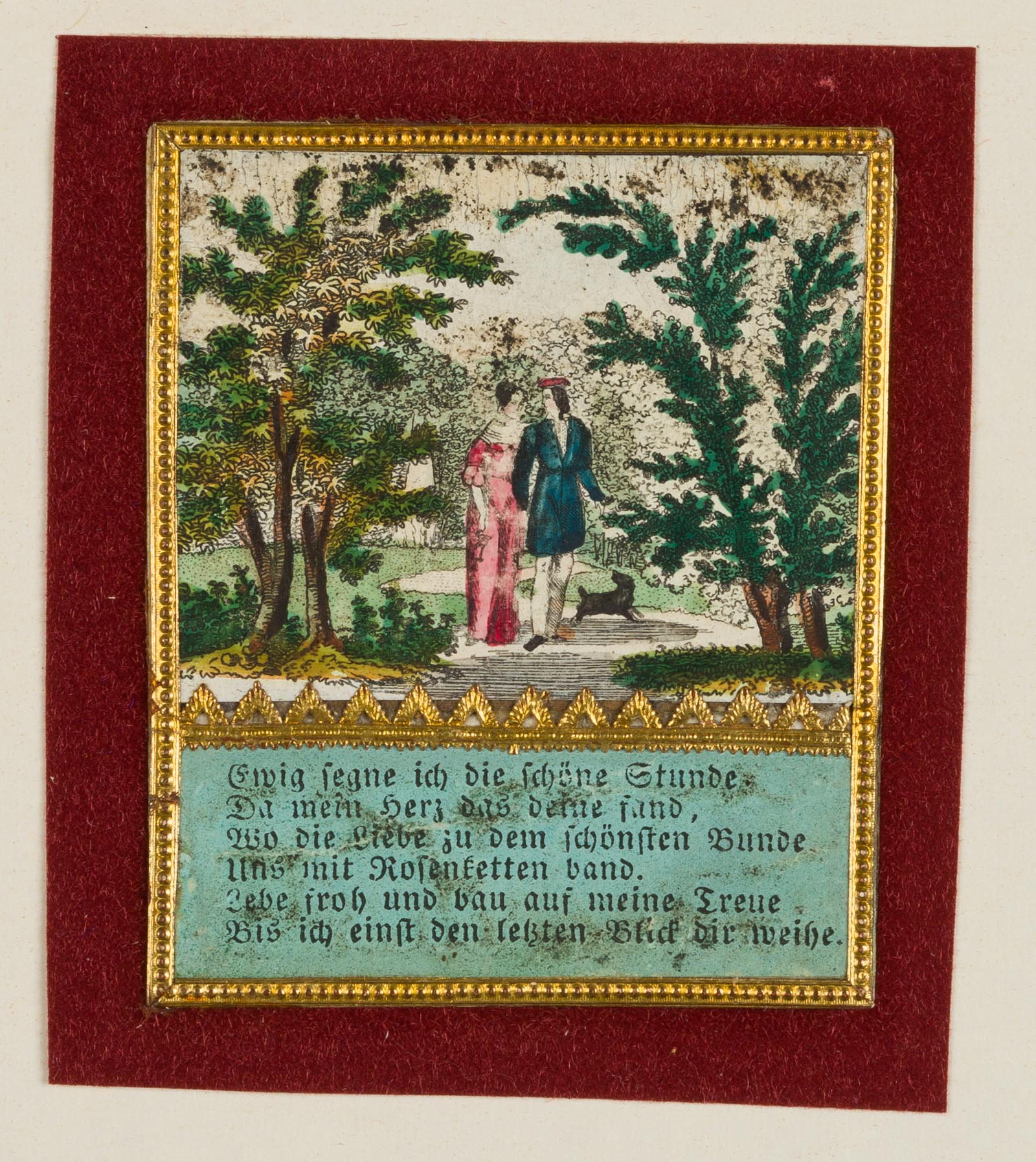 Unbekannt (19. Jahrhundert), Liebeskarte mit Segenswünschen und einem Liebespaar durch einen Park spazierend, 19. Jahrhundert, Glückwunschbillet