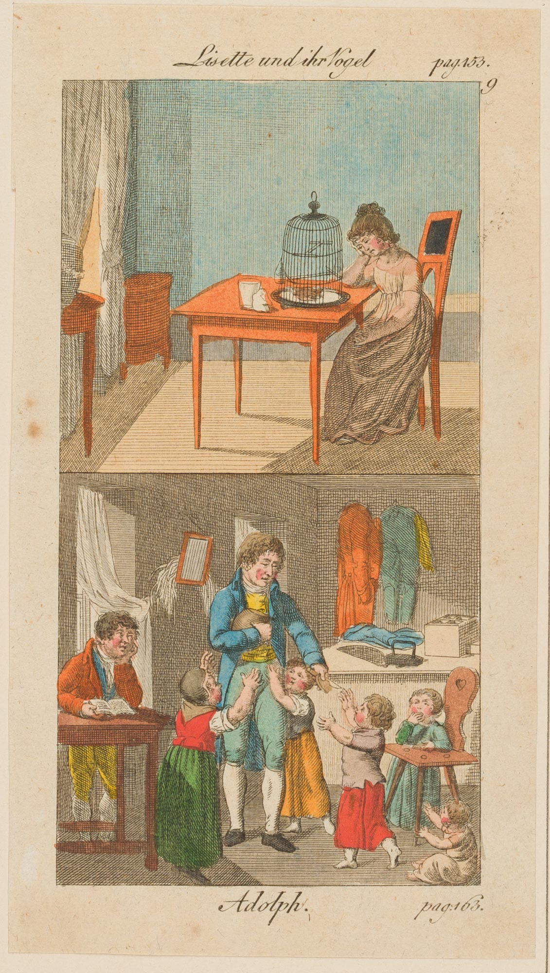 Unbekannt (19. Jahrhundert), Lit. Illust. 2 Darst., ‘Lisette und ihr Vogel’ u. ‘Adolph’ , um 1800, um 1800, Kupferstich