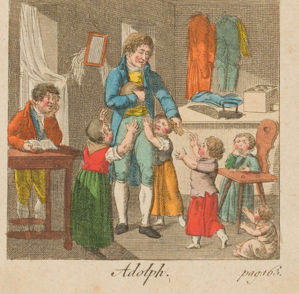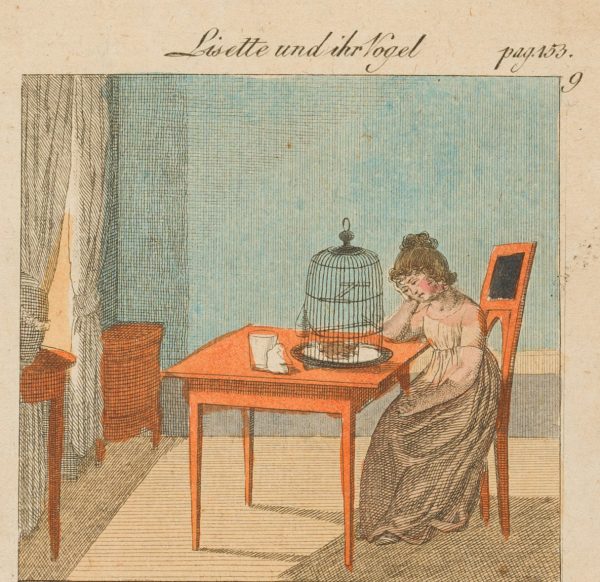 - Schlagworte: Lisette, Adolph, toter Vogel, Trauer, Vogel im Käfig, Haustier, Brot, Brotausteilung, Brotbrechen, Kinderversorgung, Kinder, Essen, literarische Illustration, Mode, Genre, Deutschland, Romantik, 1800-1849