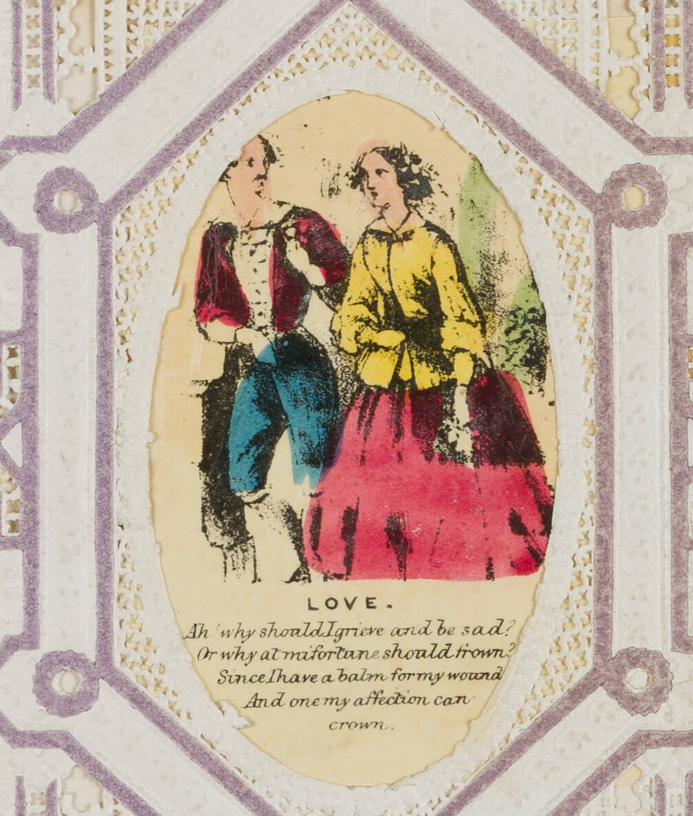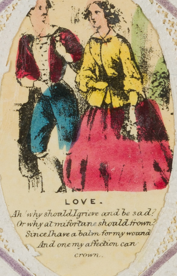 Unbekannt (19. Jahrhundert), ‘Love’ Liebespaar im Klapprahmen mit Liebesversen, um 1900, Glückwunschbillet