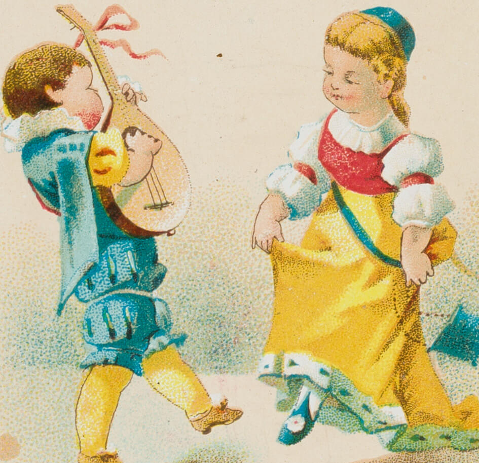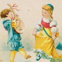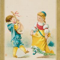 - Schlagworte: Glückwunschkarte, Freundschaft, Tanz, Knabe, Mädchen, Mandoline, Musik, Genre, Deutschland, Biedermeier, 1850-1899