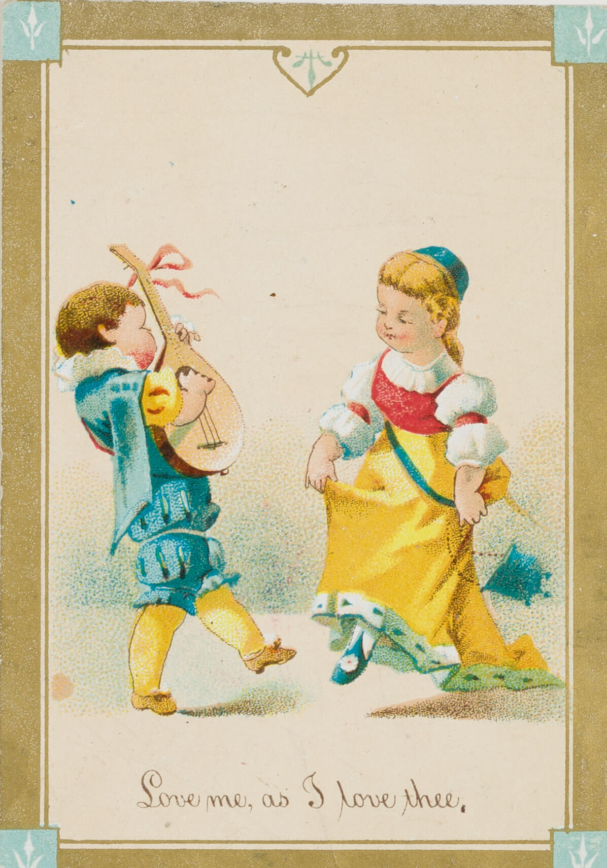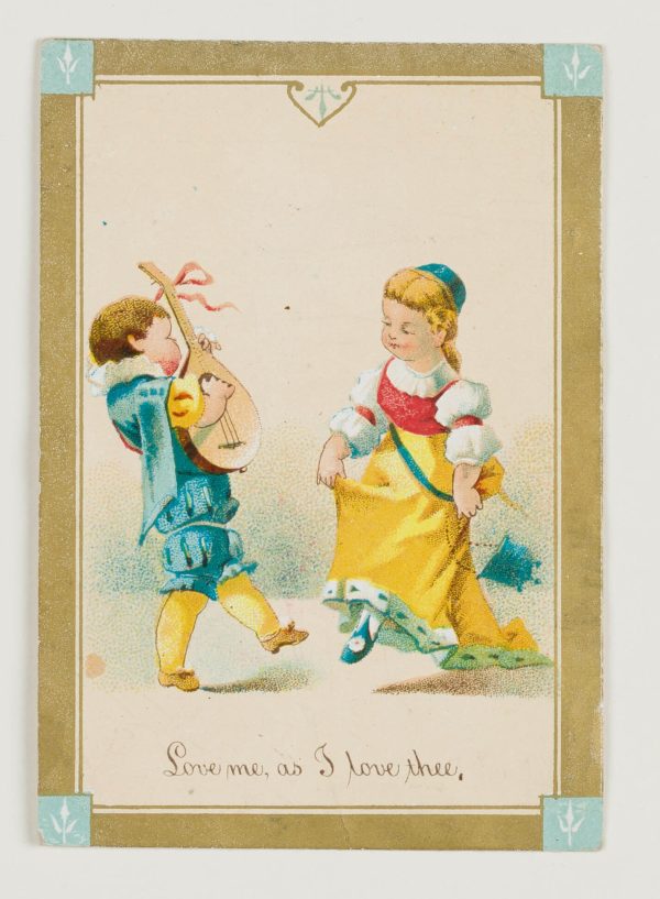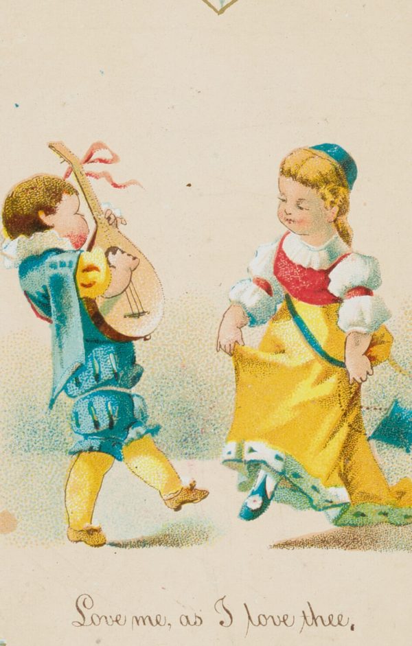 Unbekannt (19. Jahrhundert), ‘Love me, as I love thee’ mit tanzendem Knaben und Mädchen, um 1880, Glückwunschbillet