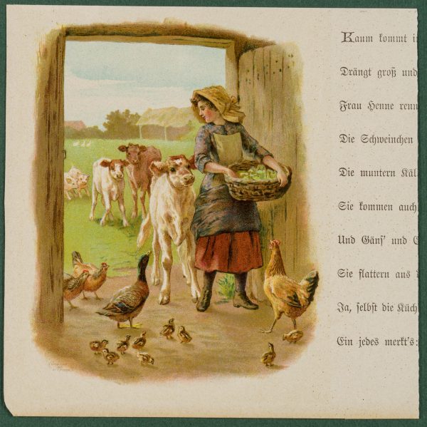 Unbekannt (19. Jahrhundert), Junges Mädchen mit Henne, Kälbchen und Gänsen. Buchillustration, 1892, Chromolithographie