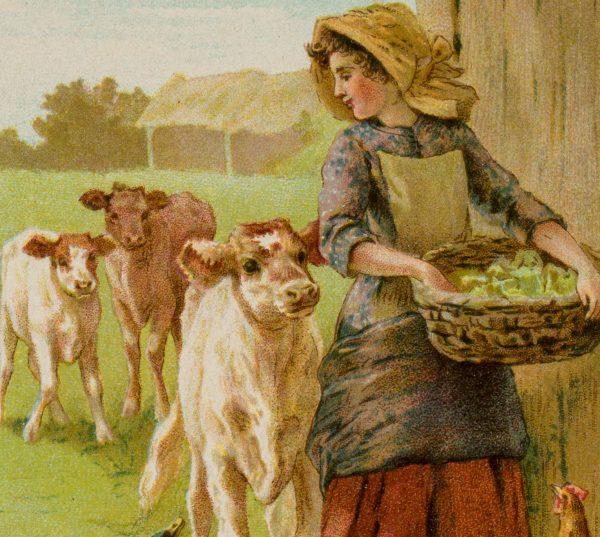 Lebendige Darstellung eines jungen Mädchens umgeben von Tieren in der Scheune und auf der Weide. In einem großen Korb trägt sie Grünzeug zur Fütterung der Kälbchen, Gänse, Kücken, Schweine und Hühner, die sich freudig um sie versammeln. - Datierung: 1892