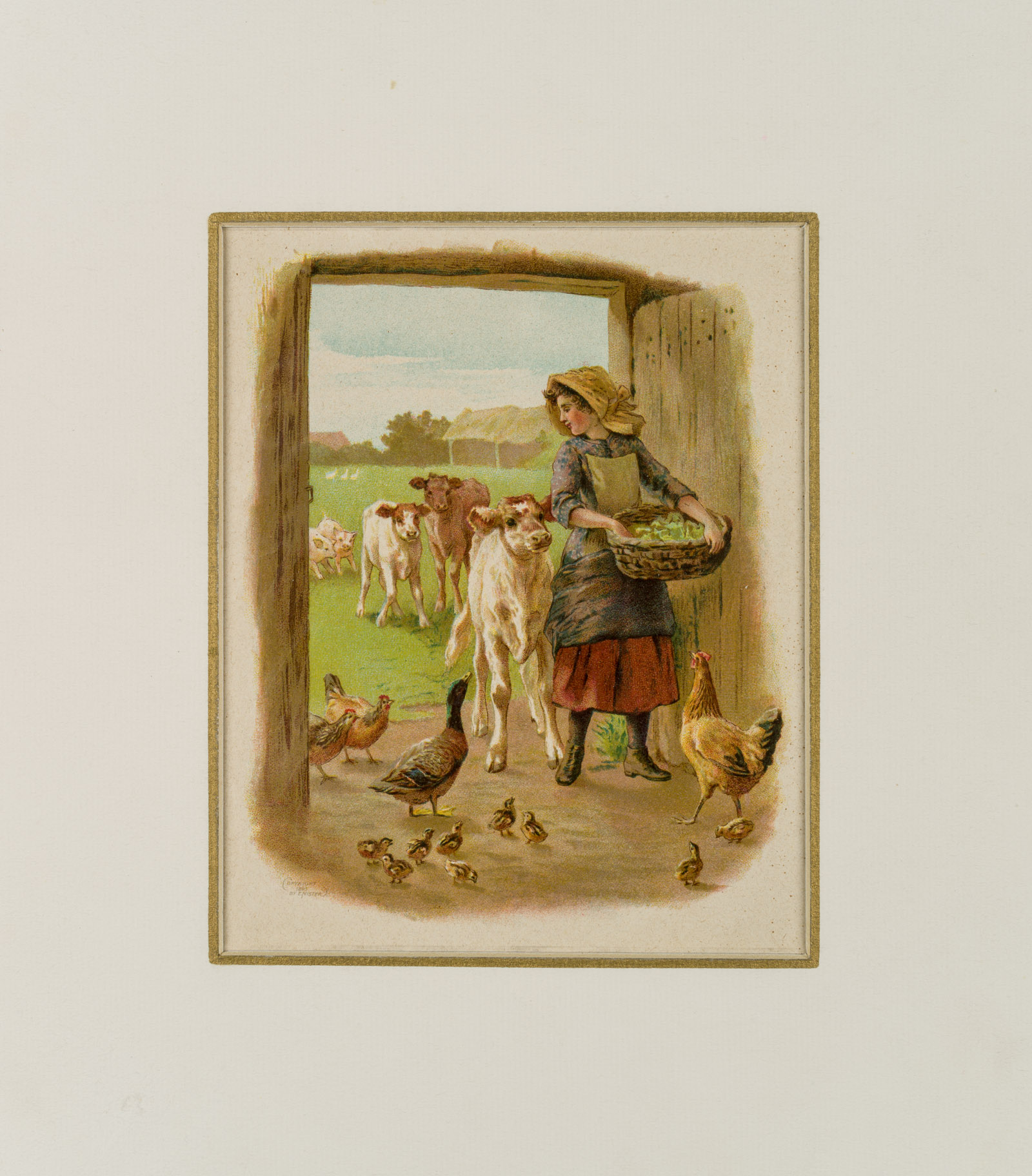 Unknown (19th century), Young girl with hen, calf and geese Book illustration, 1892, Chromolithograph