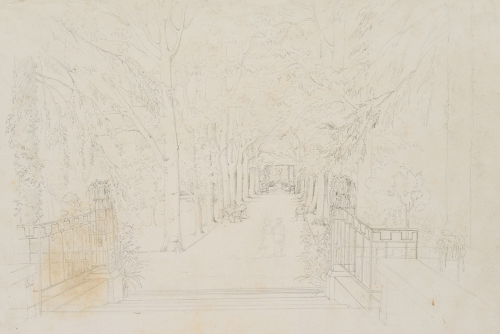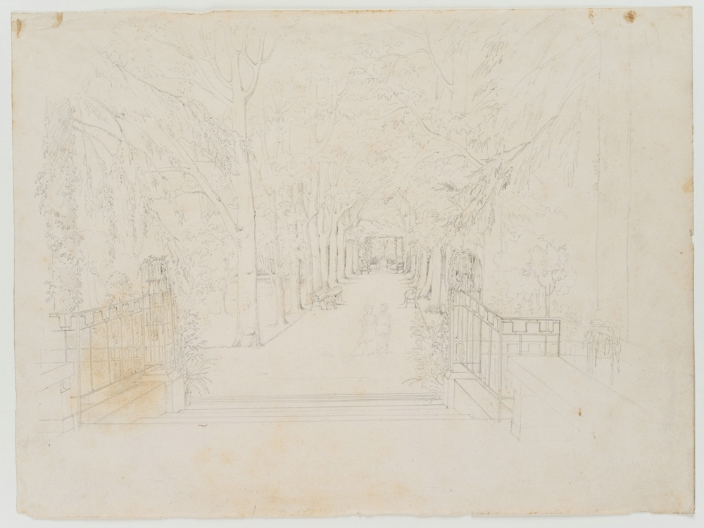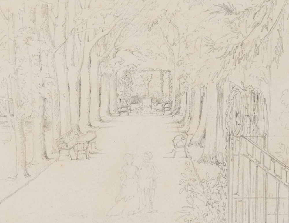 Die Darstellung zeigt einen idyllischen Landschaftsgarten mit akkurat angelegter Baumallee und einem skizzenhaft dargestellten flanierenden Paar.