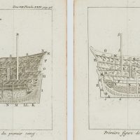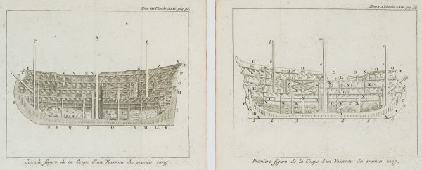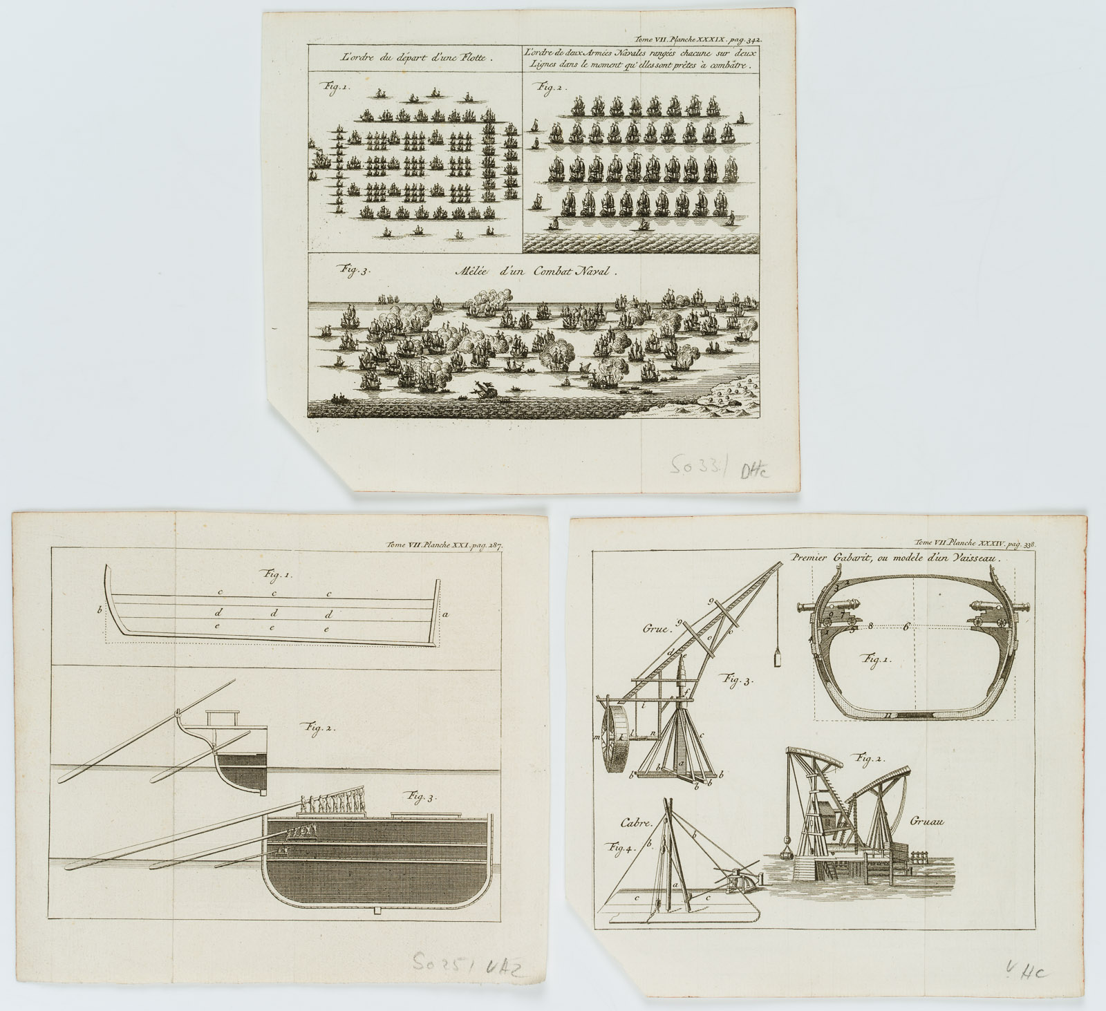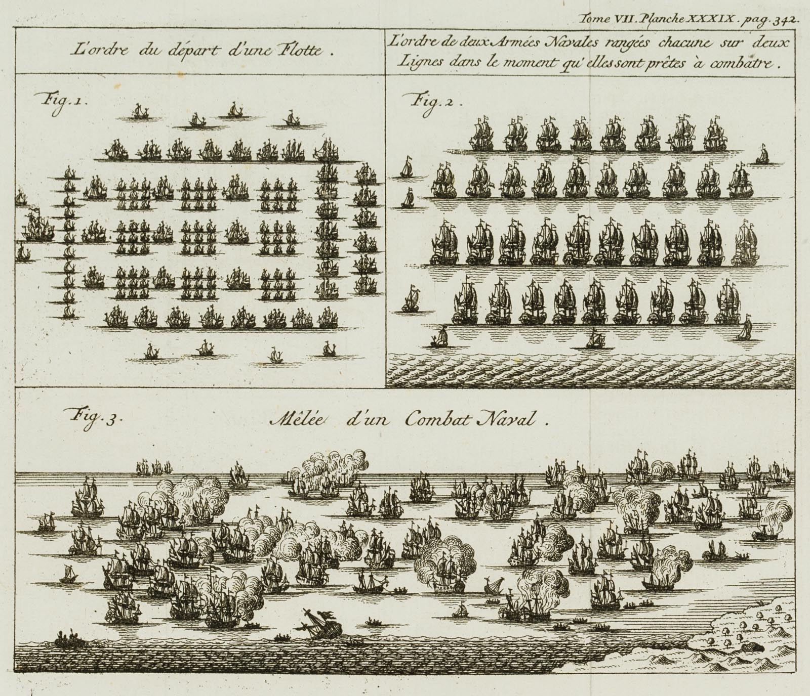 - Beschreibung: Die Pläne sind auf Französisch beschriftet mit Titeln wie “L’ordre du départ d’une Flotte” oder “Seconde figure de la Coupe d’un Vaisseau du premier rang.” Sie sind nummeriert und stammen aus der Reihe “Tome VII” Von “Planche XXI. pag. 287” bis “Planche XXXIX. pag 342.” (siehe jeweils oben rechts).