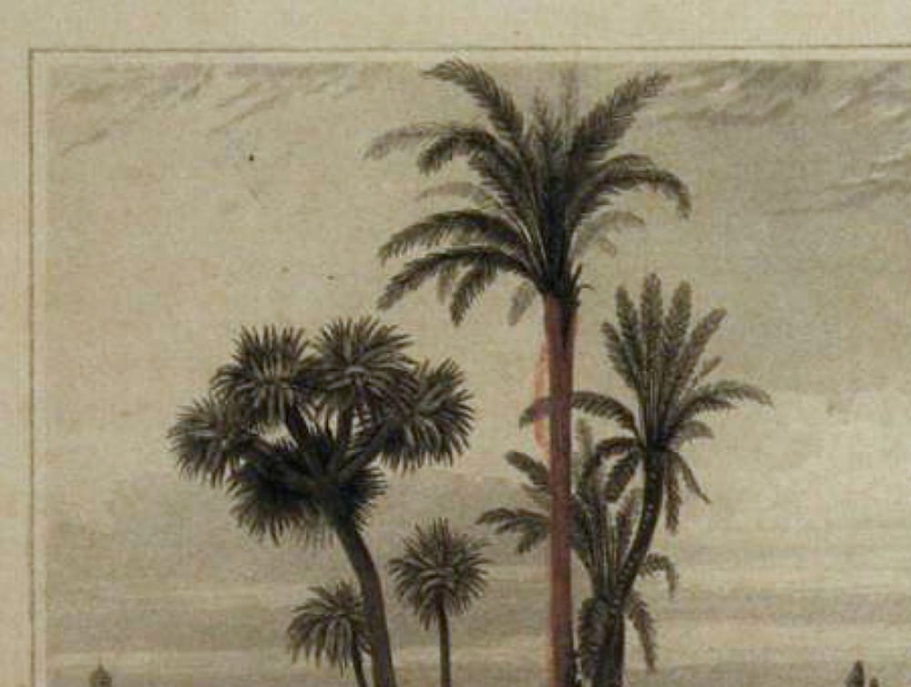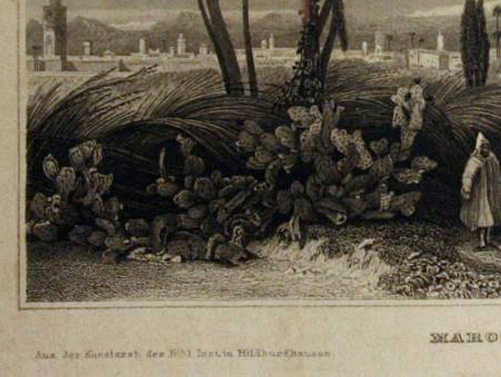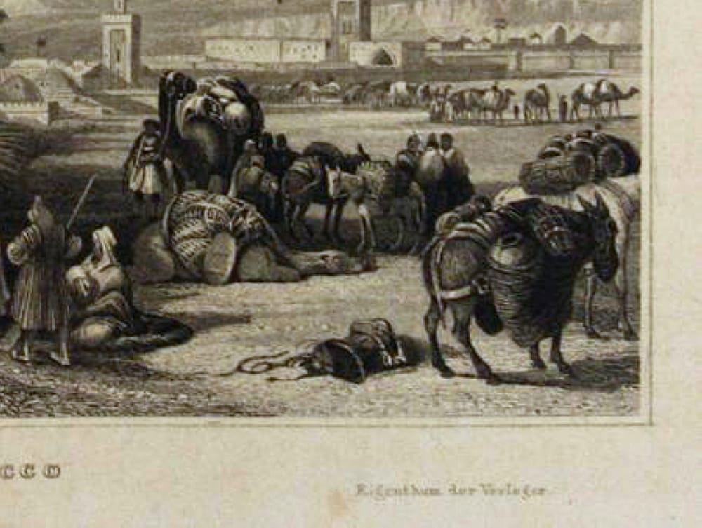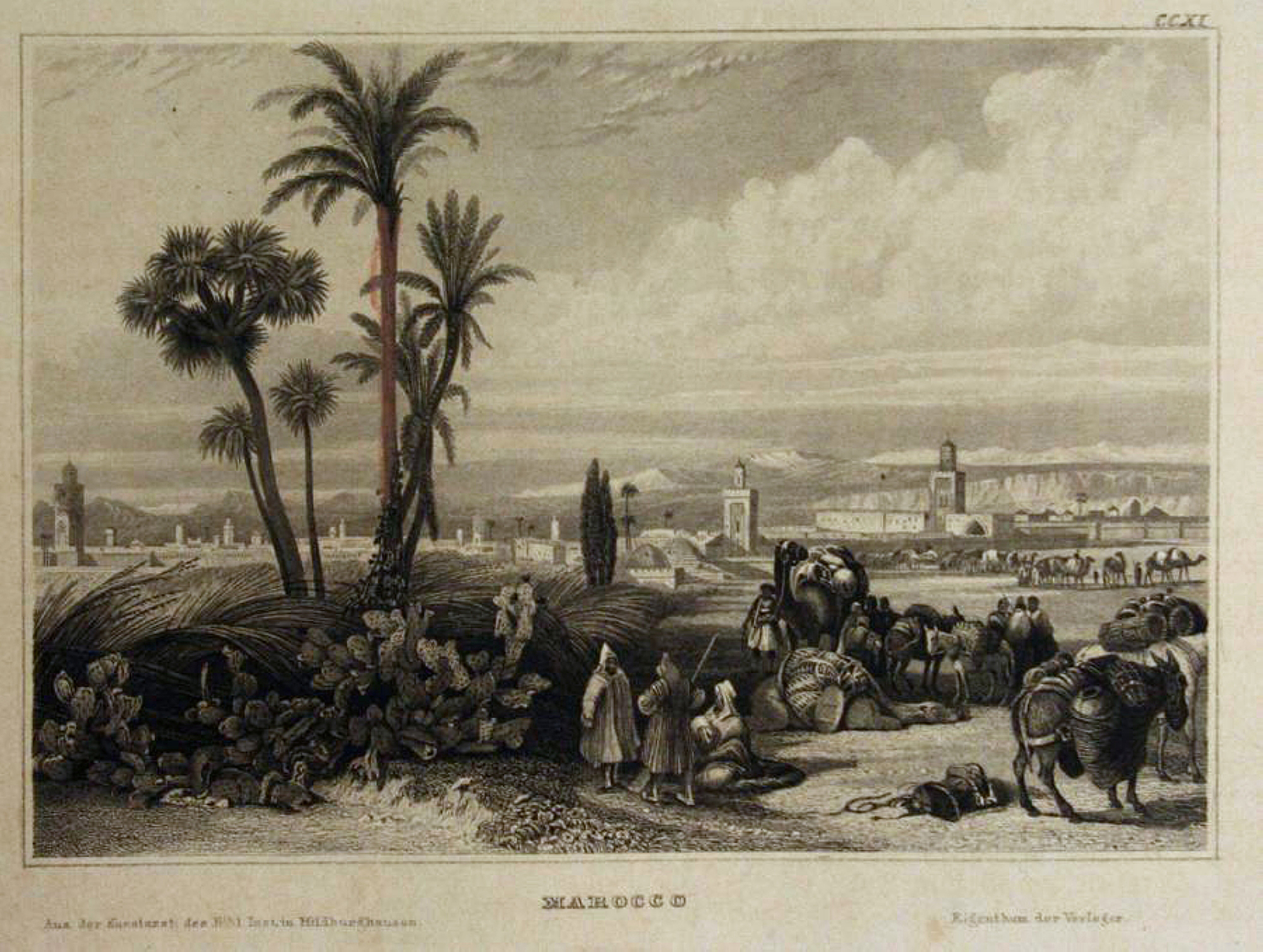 - Description: Unknown artist, Morocco: Resting caravan in front of a town, steel engraving, c. 1850. Description: Steel engraving by an unknown artist, inscribed: “Marocco Aus d. Kunstanst. d. Bibliogr. Bibliogr. Instit. in Hildbh. Property of the publisher”. A caravan rests under tall palm trees, heavily loaded with camels and mules. In front of a mountain range in the background is a town, slender towers rise far into the sky and form a clear contrast to the verticality of the flat buildings, which seem to nestle against the desert ground. Ten sheets of this motif available.