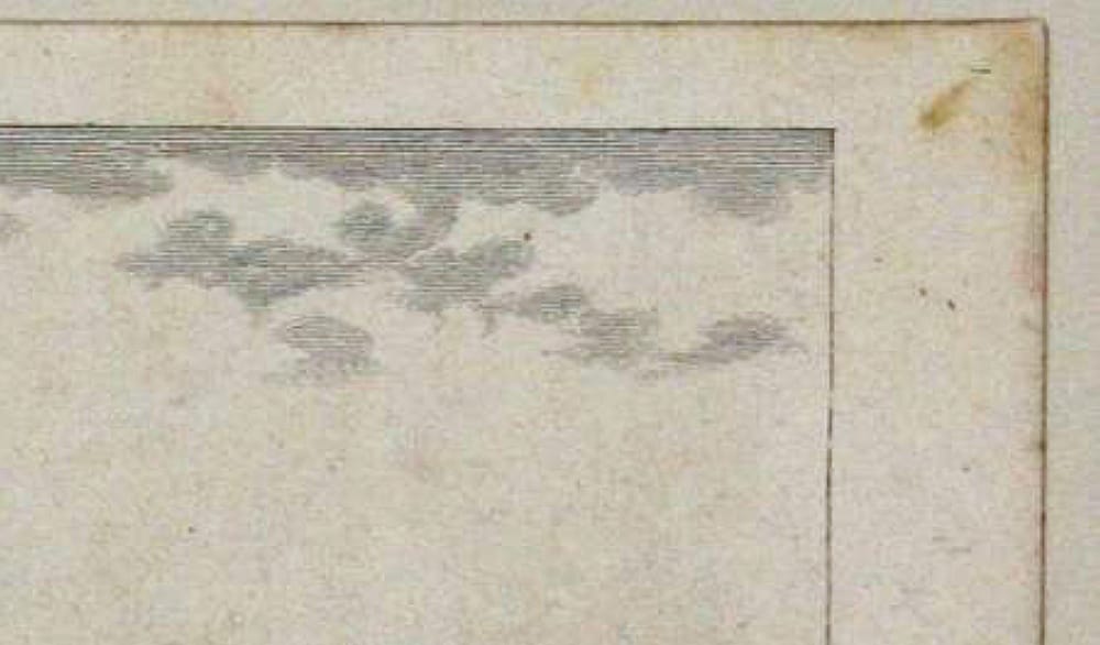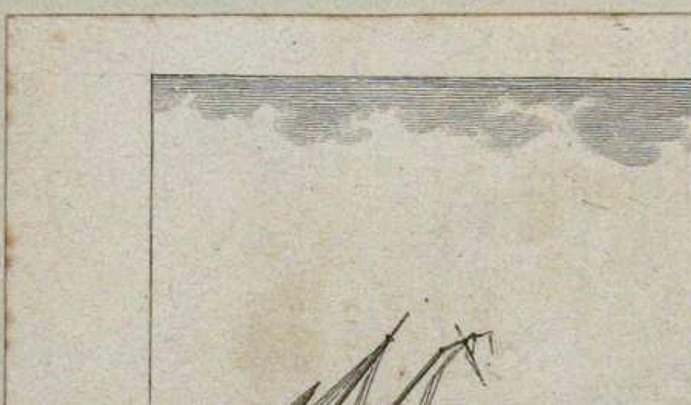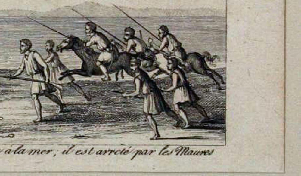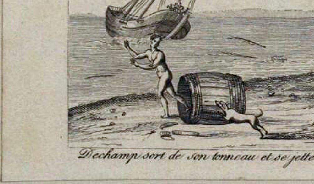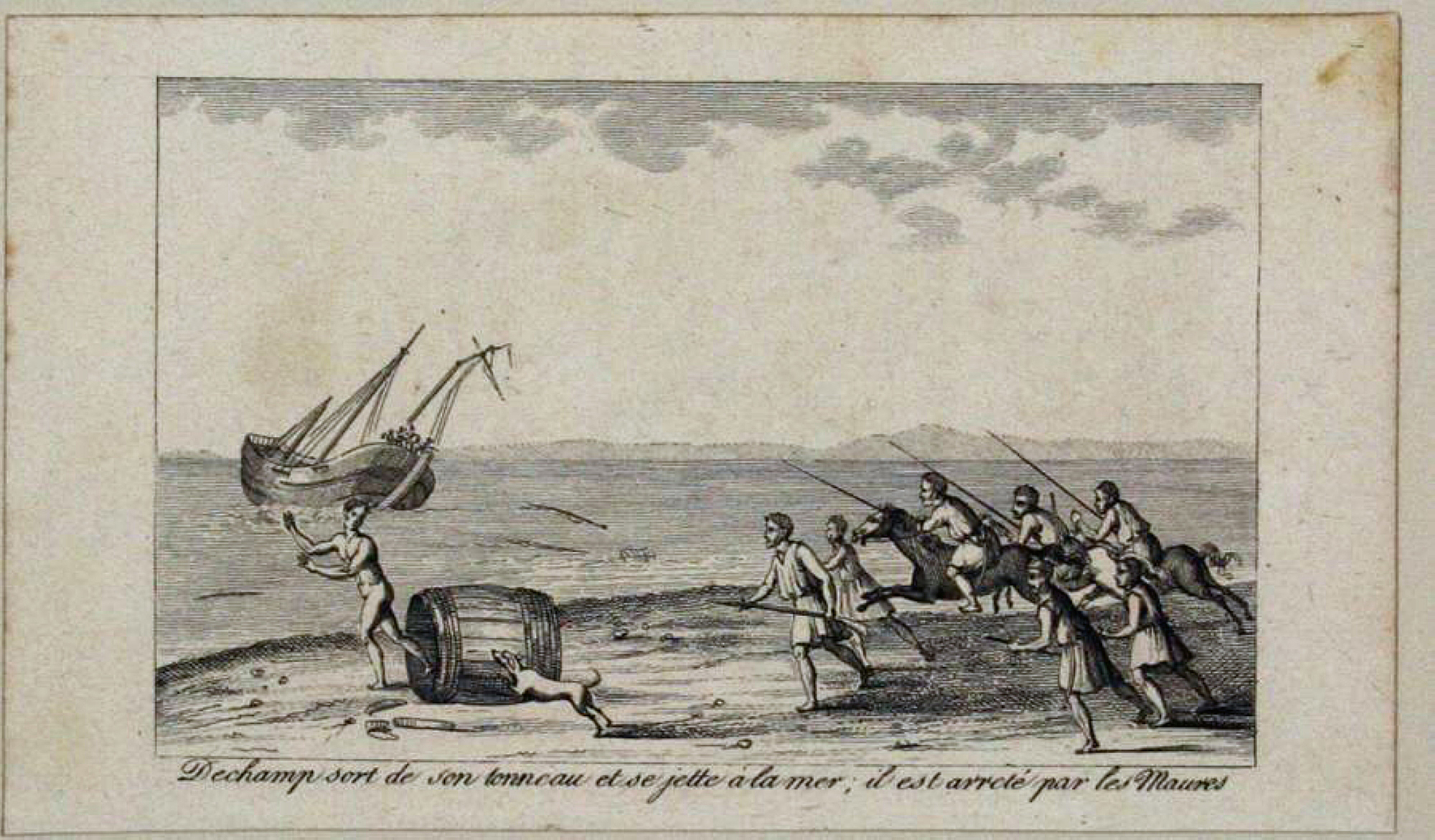Interessanter Stahlstich, bezeichnet in der Platte unten: “Dechamp sort de son tonneau et se jette à la mer il est arreté par les Maures”. Am Ufer des Meeres verfolgt eine Gruppe Mauretanier mit Speeren und Gewehren bewaffnet einen unbekleideten Mann. Er scheint soeben aus einer Tonne gestiegen. Ein mächtiges Segelschiff nahe der Küste gibt Antwort auf die Frage nach der Ursache dieser Szene: Das Schiff scheint zu sinken, es liegt auf der Seite, die Masten sind gebrochen, Planken treiben im Wasser und die Besatzung hat sich angstvoll am Bug versammelt.