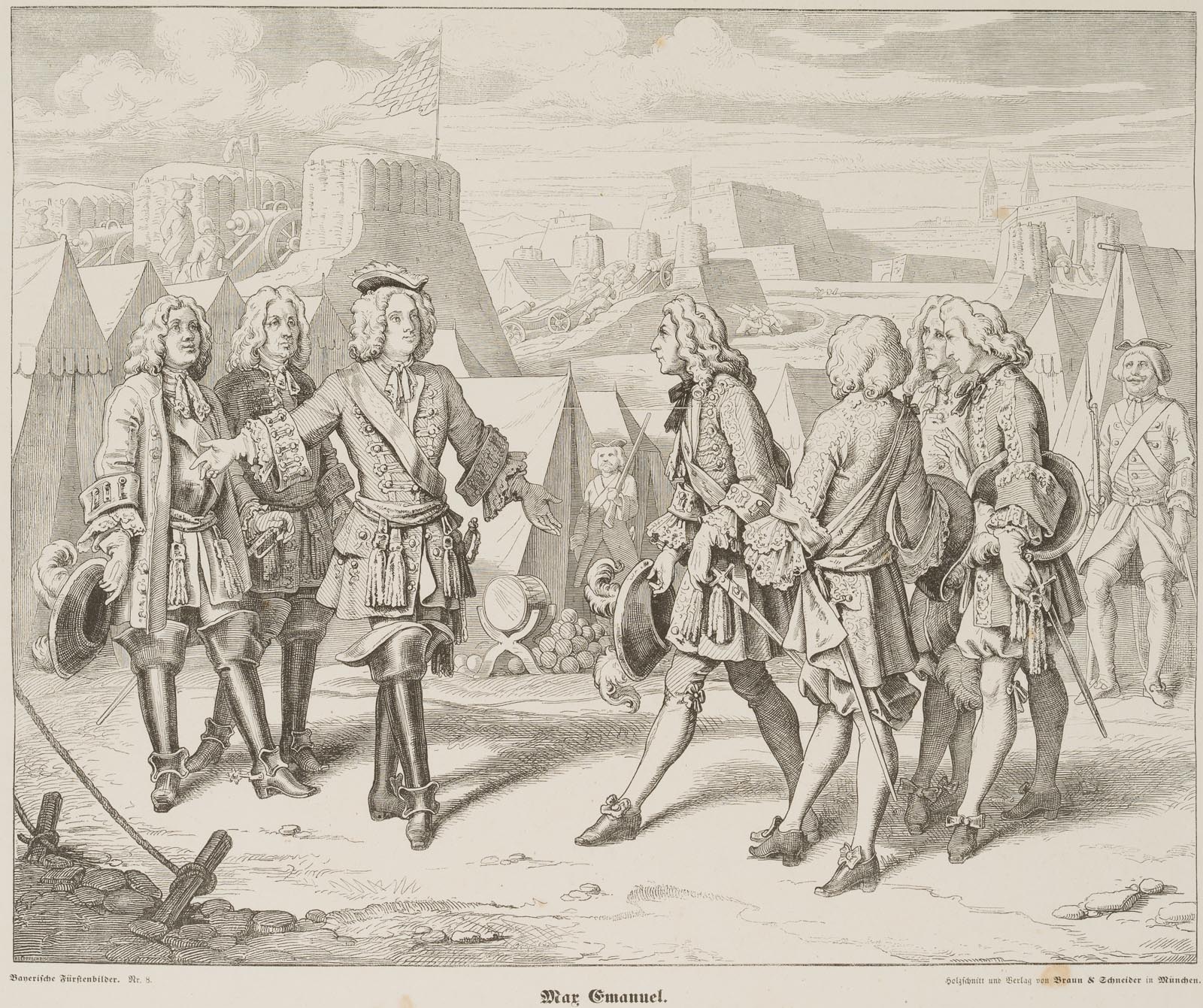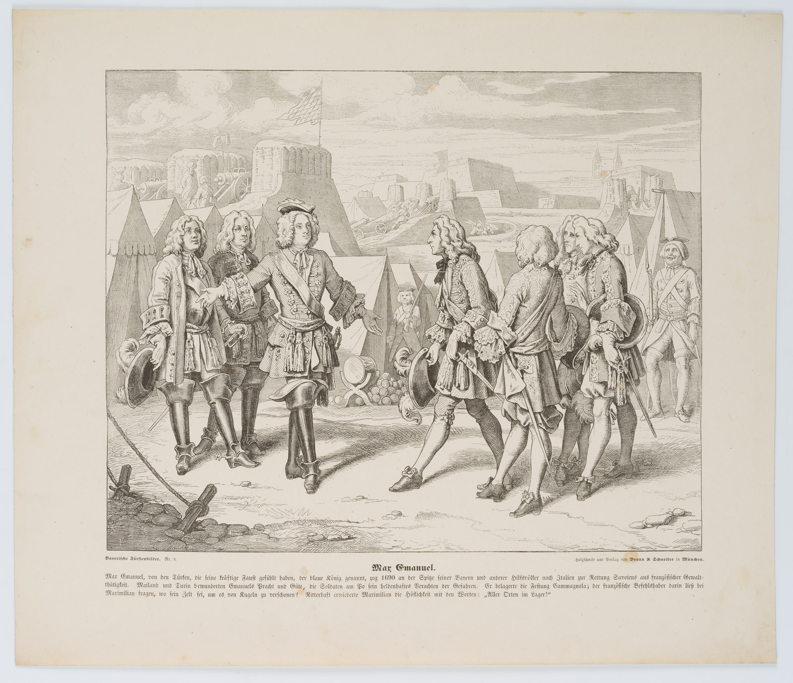 Unknown (19th century), Historical depiction with the Wittelsbach Maximilian II Emanuel (1662 Munich – 1726 ibid), Elector of Bavaria, in the camp of his soldiers, from the series: Bavarian Images of Princes No 8, 19th century, Wood engraving