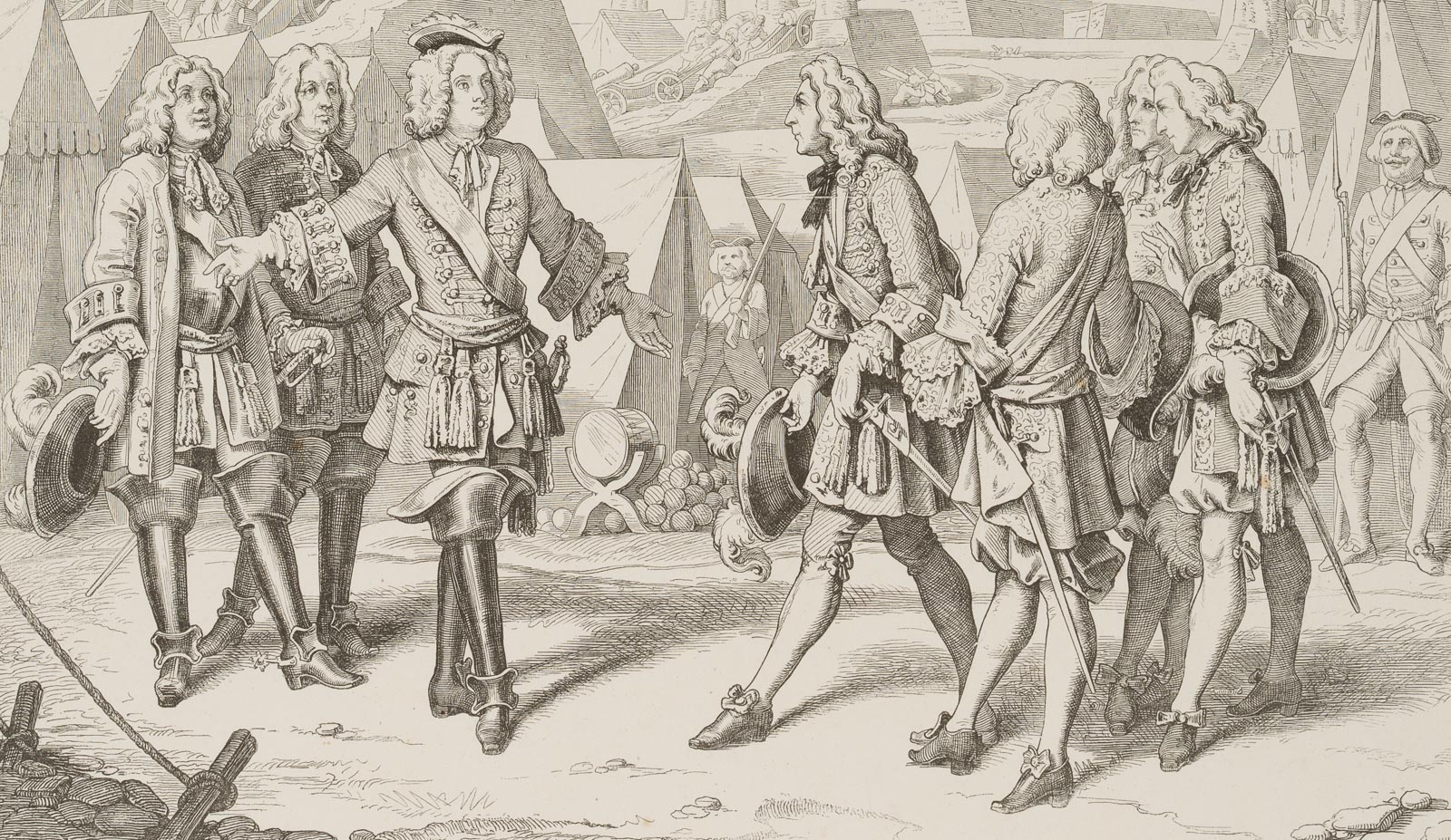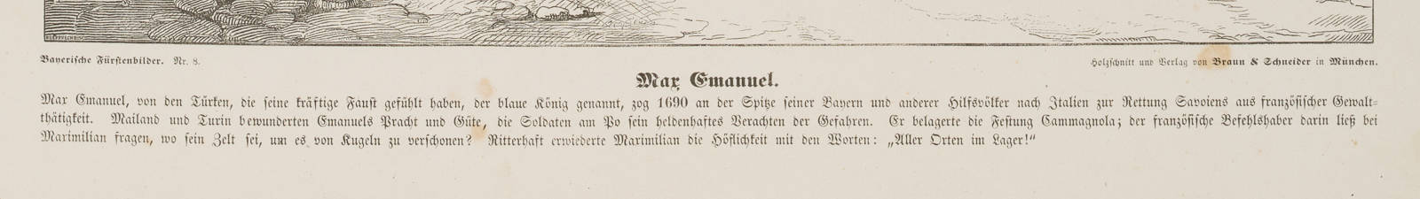 Unbekannt (19. Jahrhundert), Historiendarstellung mit dem Wittelsbacher Maximilian II. Emanuel (1662 München – 1726 ebenda), Kurfürst von Bayern, im Lager seiner Soldaten, aus der Reihe: Bayerische Fürstenbilder Nr. 8, 19. Jahrhundert, Holzstich