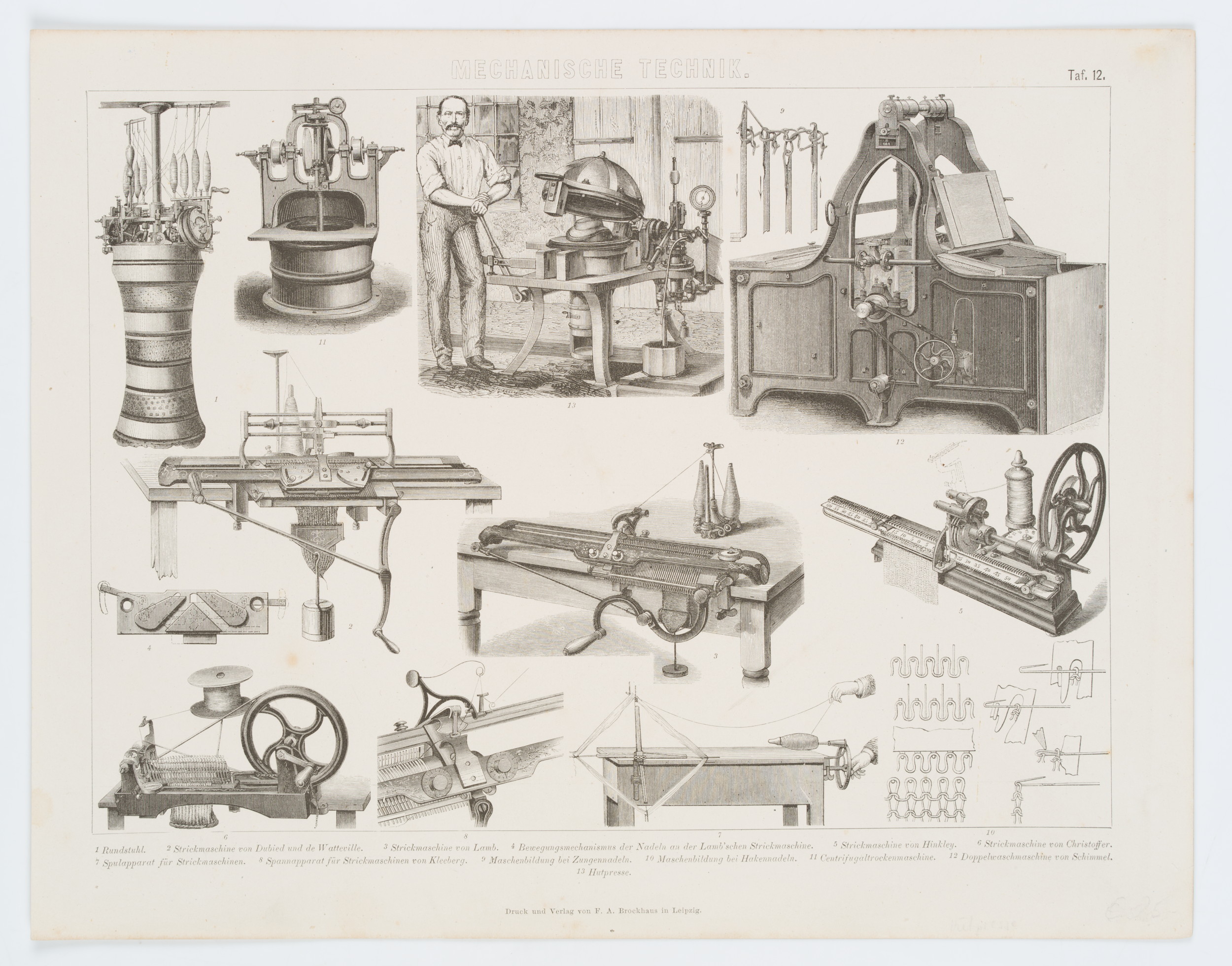• Inscription: Lower middle inscribed in the printing plate: “MECHANISCHE TECHNIK. | 1 Rundstuhl. 2 Strickamschine von Dubied und de Watteville. 3 Strickmaschine von Lamb. […]”.