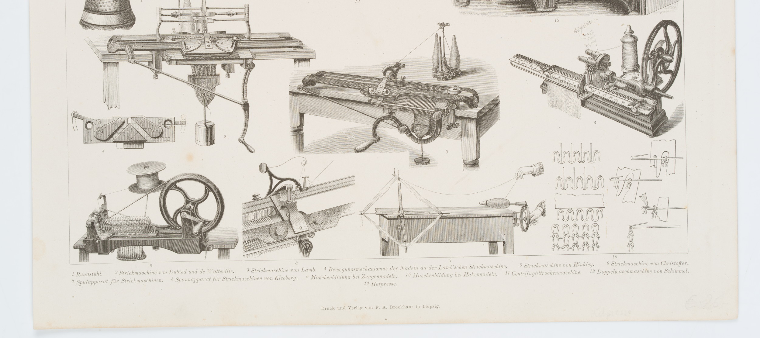 • Bezeichnung: Unten mittig im Druck bezeichnet: “MECHANISCHE TECHNIK. | 1 Rundstuhl. 2 Strickamschine von Dubied und de Watteville. 3 Strickmaschine von Lamb. [..]”.