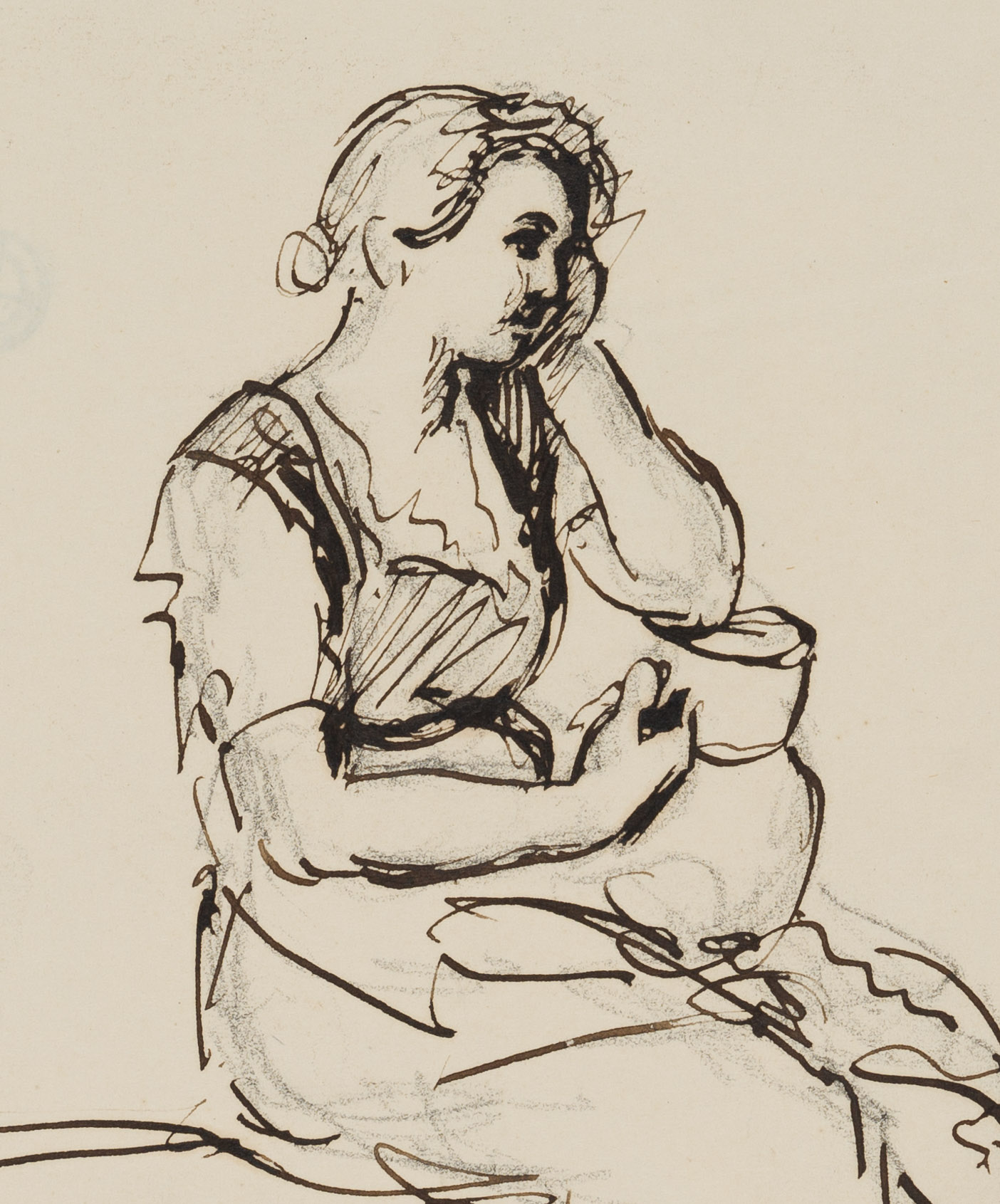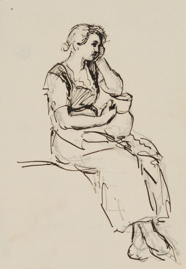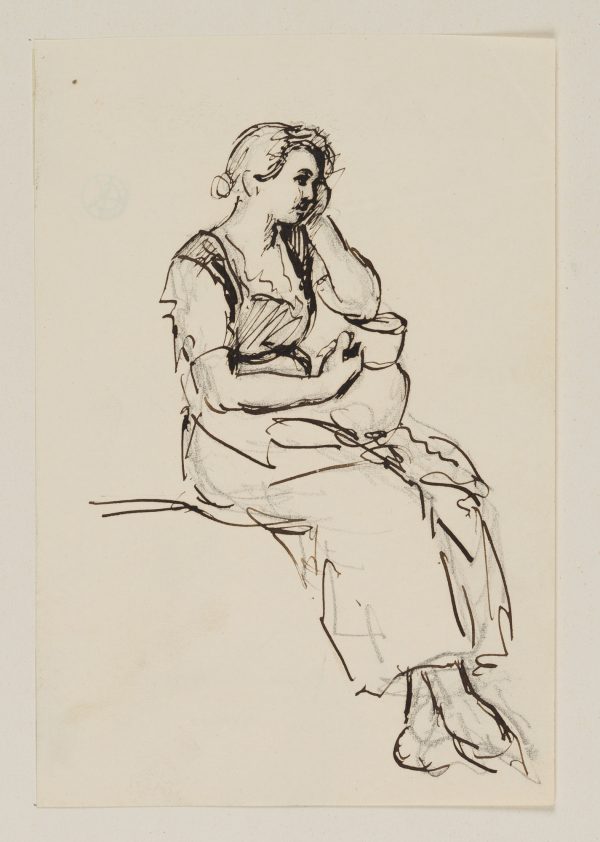 Unbekannt (19. Jahrhundert), MEYER-BREMEN, Portraitskizze. Magd sitzend mit Krug., 19. Jahrhundert, Bleistift