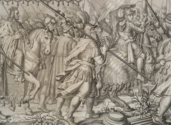 - Zustand: Guter Zustand. Das Papier hat sich altersbedingt verfärbt und ist stellenweise fleckig. Kleines Loch in der Mitte, auf des Rückens des Fußsoldaten in der Mitte mit langem Mantel. Mehrere Knickfalten senkrecht über die Mitte. Blattecke links oben knitterfaltig.