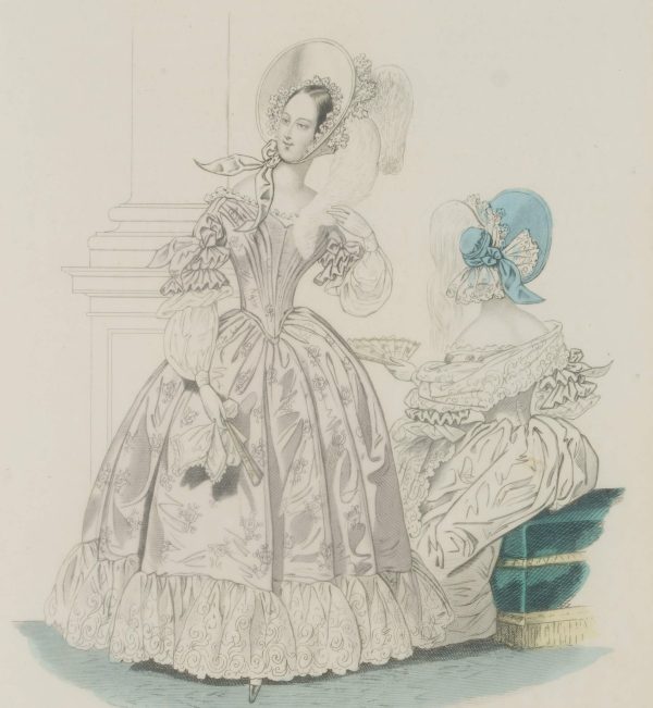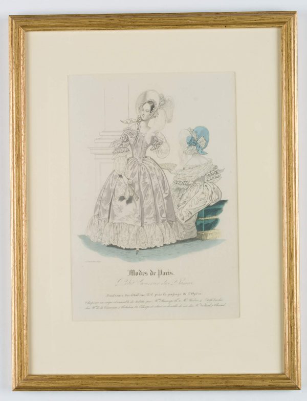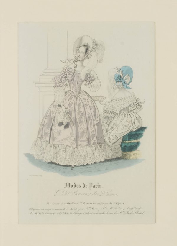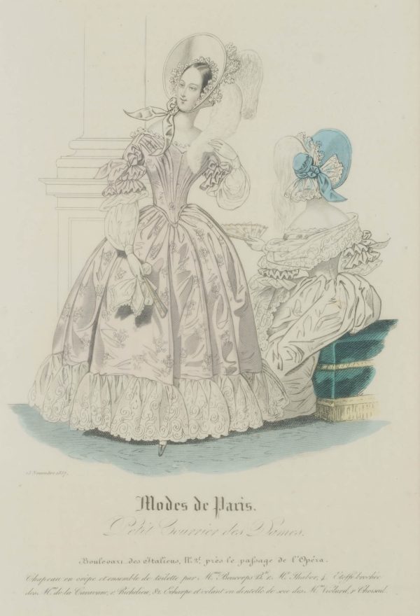 - Inscription: Lower middle inscribed in the printing plate: “Modes de Paris. Petit Courrier des Dames. Boulevard des Italiens, N. 2, près le paysage de l’Opéra”. Lower middle dated: “15 Novembre 1837”.