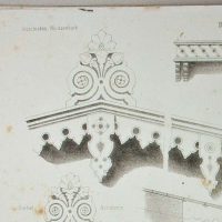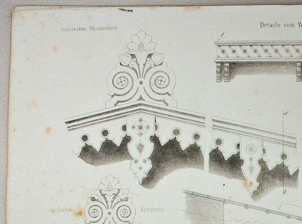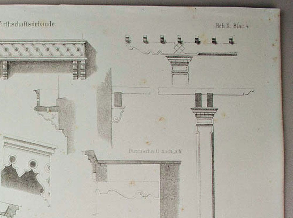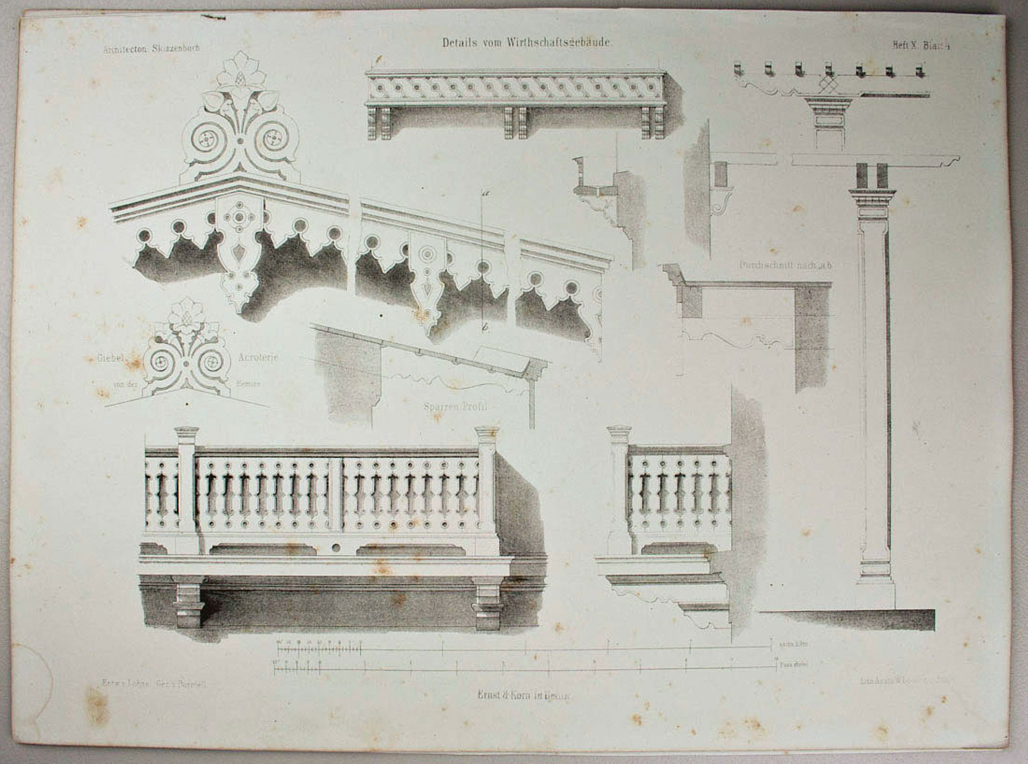 - Description: 1. details of the farm building: rafter profile. Gable acroterie from the shed. Average to a b. Lithograph (1860-1866). Lith. Anst. v. W. Loeillot in Berlin. Designed by V. Lohse. Gez. v. Brosell Heft X. Sheet 4. size of the sheet: 25,1 x 34,5 cm. From the Architectonisches Skizzenbuch published by Ernst & Korn in Berlin. This is ?La Tête de collection ? the French edition of this contemporary German architecture. The text pages were translated and printed in Paris. The first French edition (July 1860) corresponds with edition 41 of the German edition.
