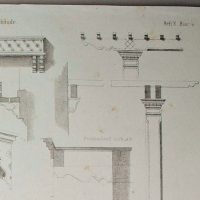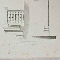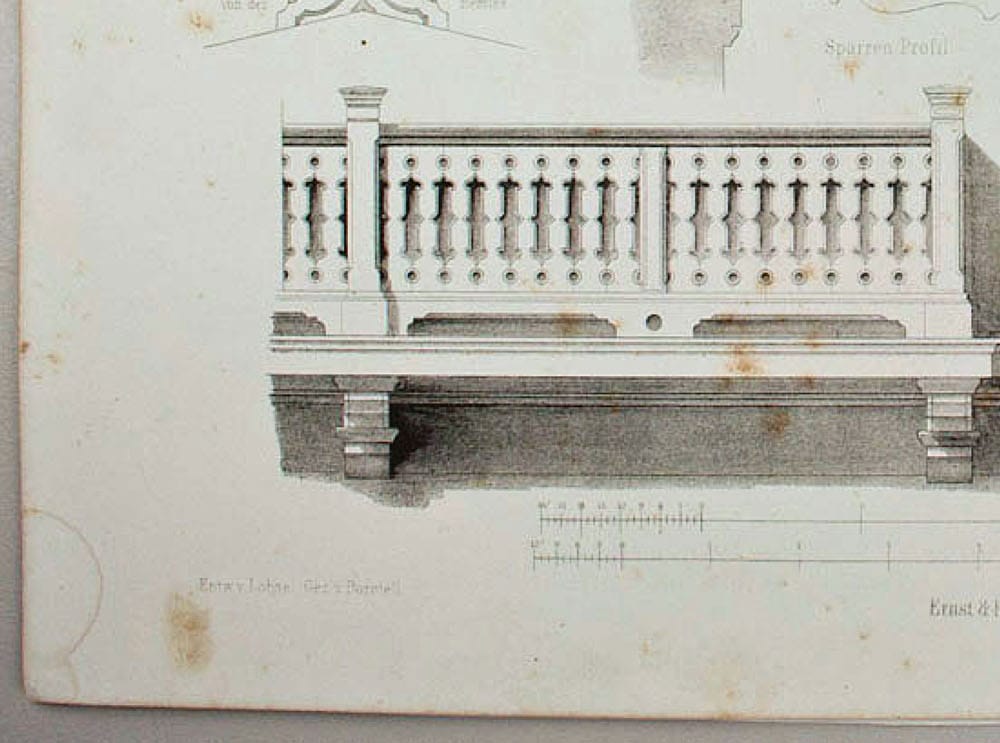 - Beschreibung: 1. Details vom Wirtschaftsgebäude: Sparrenprofil. Giebel Acroterie von der Remise. Durchschnitt nach a b. Lithographie (1860-1866). Lith. Anst. v. W. Loeillot in Berlin. Entw. V. Lohse. Gez. v. Brosell Heft X. Blatt 4. Größe des Blattes: 25,1 x 34,5 cm. Aus dem Architectonisches Skizzenbuch Verlag Ernst & Korn in Berlin. Es handelt sich hierbei um ?La Tête de collection ? die Französische Ausgabe dieser zeitgenössischen Deutschen Architektur. Die Textseiten wurden übersetzt und gedruckt in Paris. Die erste Französische Ausgabe (Juli 1860) korrespondiert mit der Ausgabe 41 der Deutschen Ausgabe.