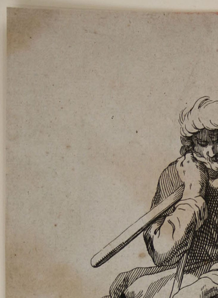 Niederländischer Künstler, Ruhender Bauer, Kupferstich, um 1800. Beschreibung: Kupferstich eines unbekannten Künstlers, bezeichnet unten: “Tertia Pars Heet derde deel”. Schöne Ansicht eines ruhenden Bauern auf einem Stein. Er stützt sein Haupt auf seinen Dreschflegel, die Sense liegt neben ihm am Boden.