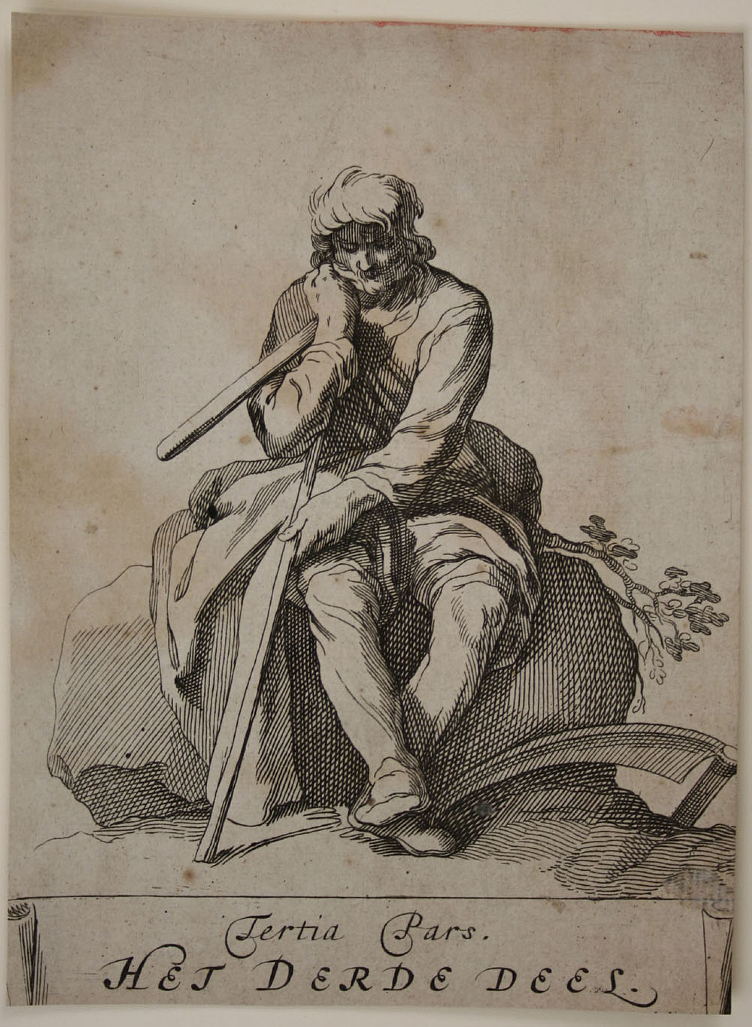 • Description: Dutch artist, Resting farmer, copper engraving, c. 1800. Description: Copper engraving by an unknown artist, inscribed at the bottom: “Tertia Pars Heet derde deel”. Beautiful view of a resting farmer on a stone. He rests his head on his flail, the scythe lies beside him on the ground.