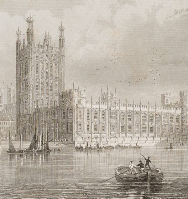 - Description: Facade of the imposing architectural complex on the banks of the Thames. The neo-Gothic complex houses the British Parliament, the House of Commons and the House of Lords. In the foreground, ships on the Thames and figures in local and period costume.
