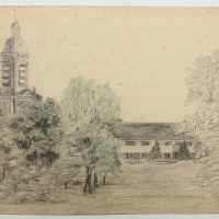 Unknown (19th century), Park near housing estate and historic church tower, c. 1900, Pencil