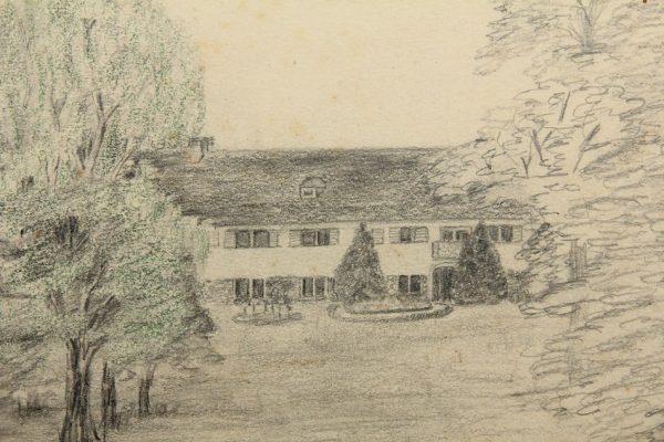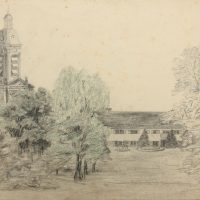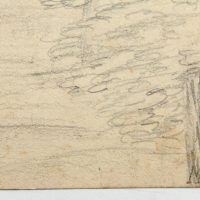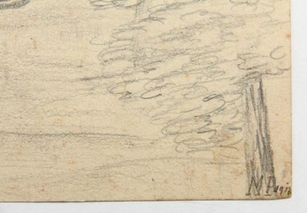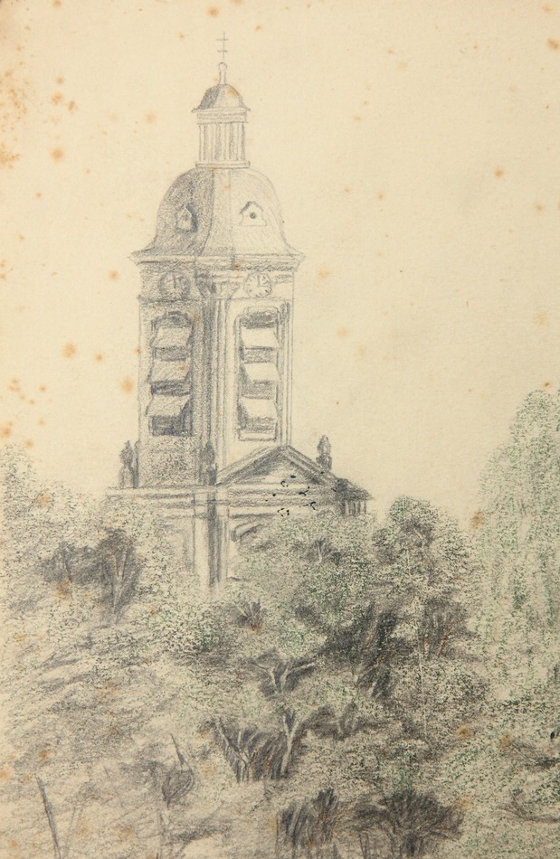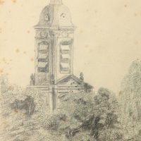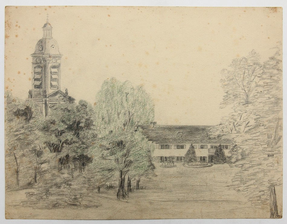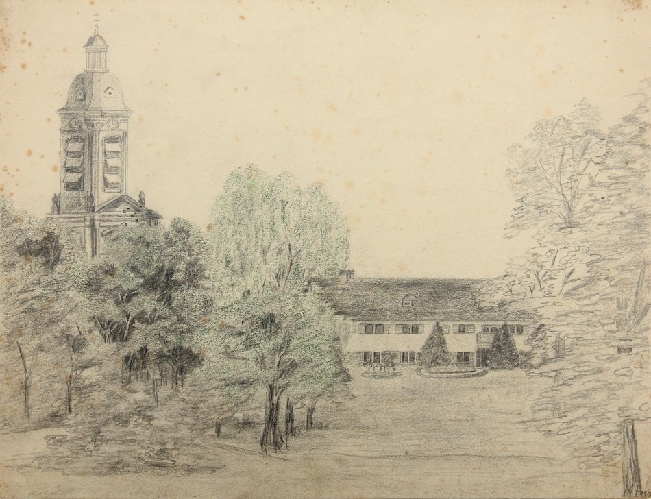 Unbekannt (19. Jahrhundert), Park bei Wohnanlage und historistischem Kirchturm, um 1900, Bleistift