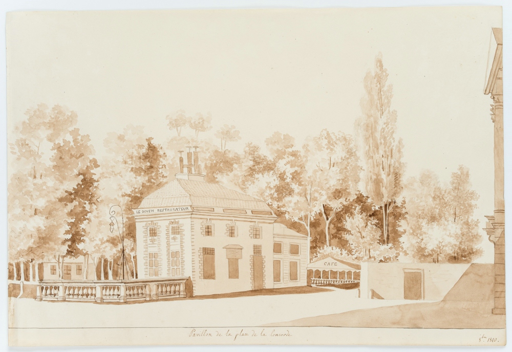 - Beschreibung: Ansicht eines kleinen Pavillon mit der Inschrift “Le Doven Restaurateur” vor einer Parklandschaft.