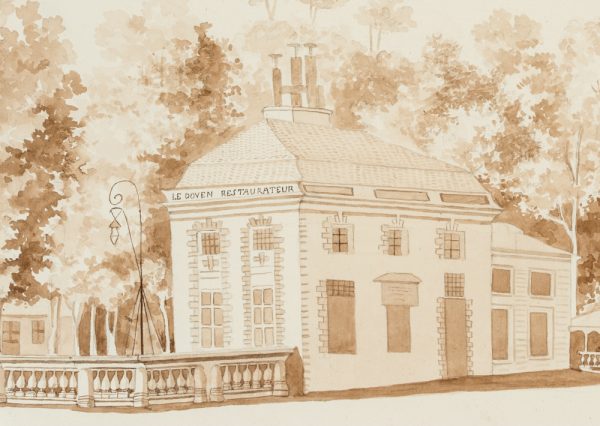 - Description: View of a small pavilion with the inscription “Le Doven Restaurateur” in front of a park landscape.