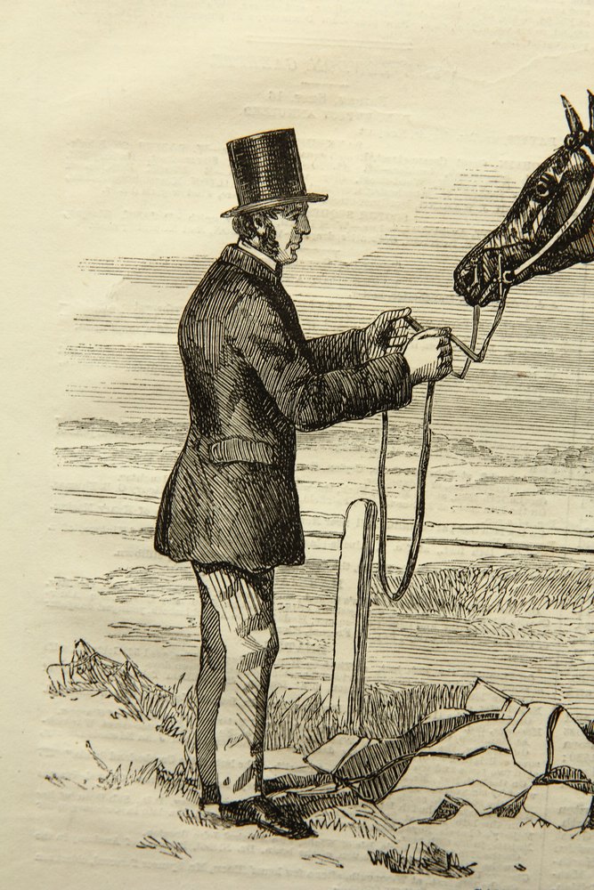 - Beschreibung: Nach einer Zeichnung von Harry Hall (19. Jahrhundert, England). Ganzfiguriges Pferdeporträt von der Seite, zusammen mit dem Pferdehalter und dem Pfleger.