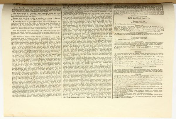 - Bezeichnung: Unten rechts in der Darstellung befindet sich im Druckstock die Signatur Halls. Darunter ist das Blatt bezeichnet. Rückseitig befindet sich der typographische Druck einer englischsprachigen Zeitung.