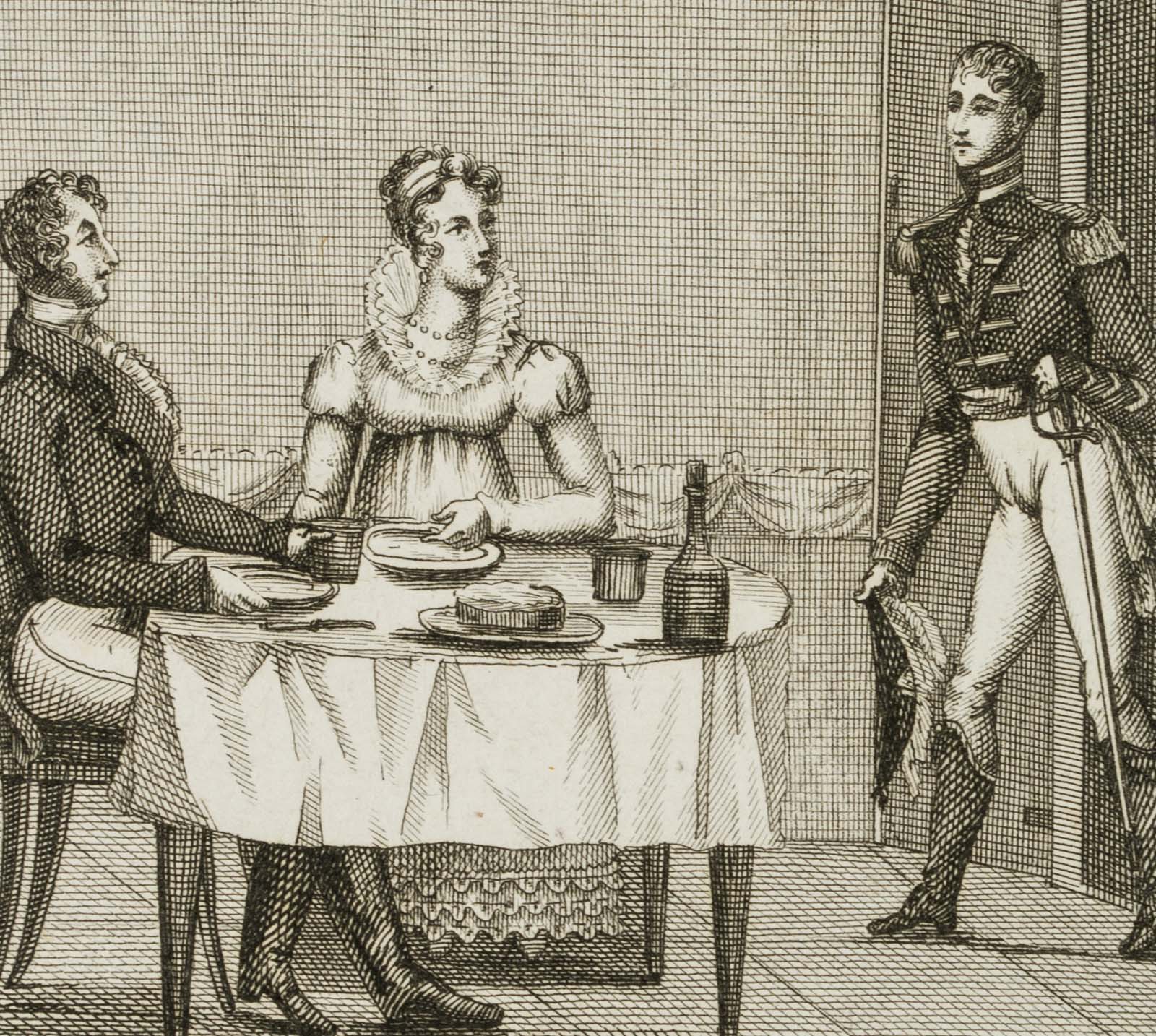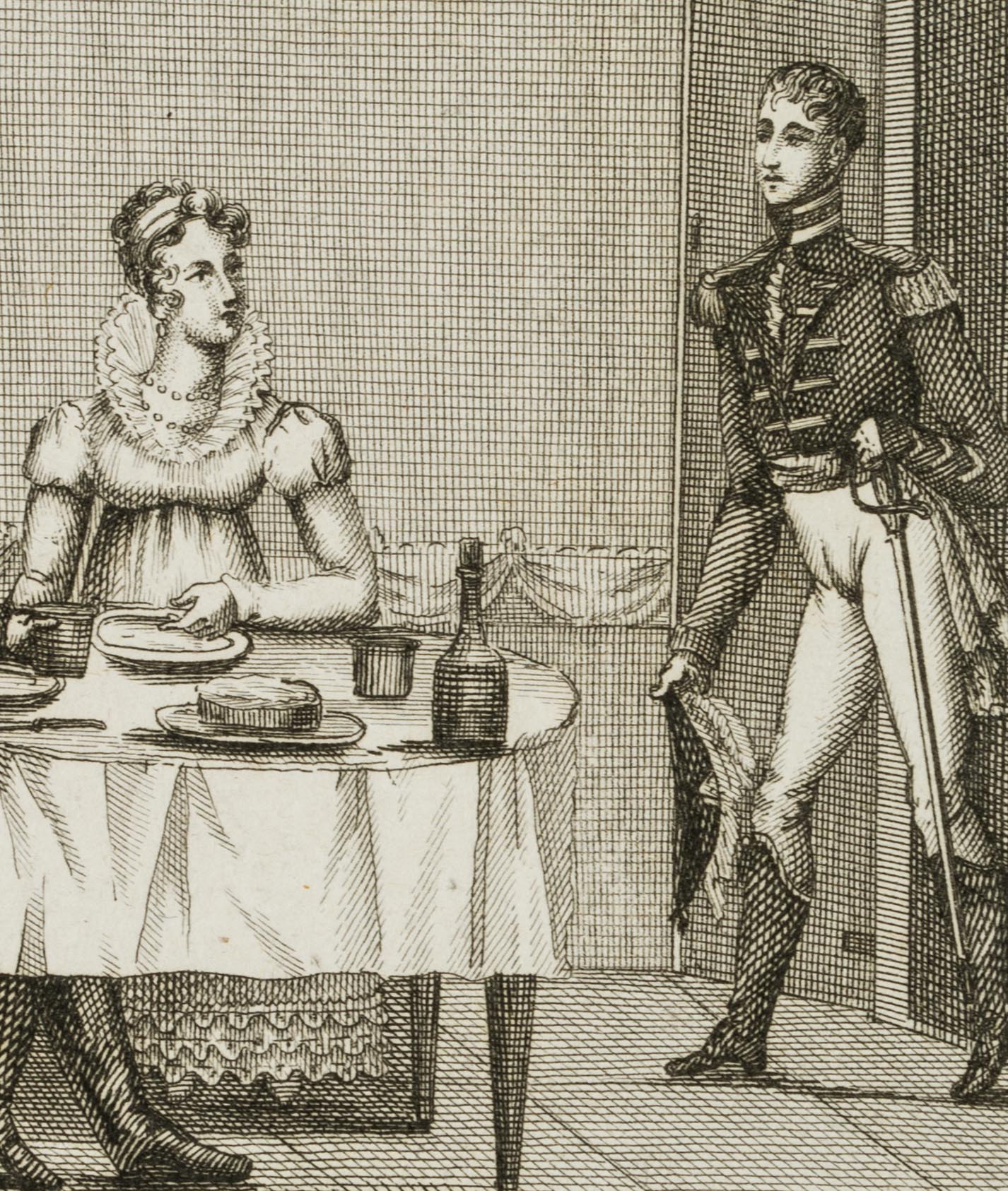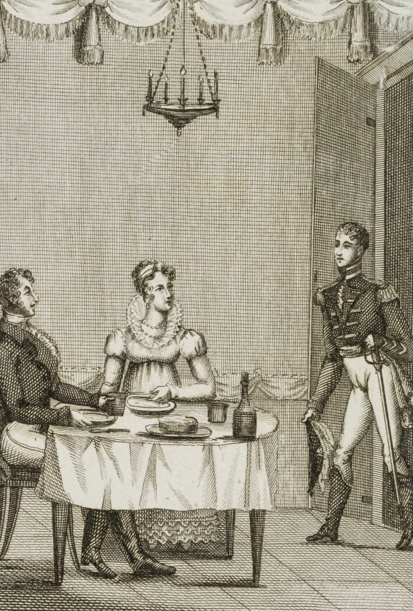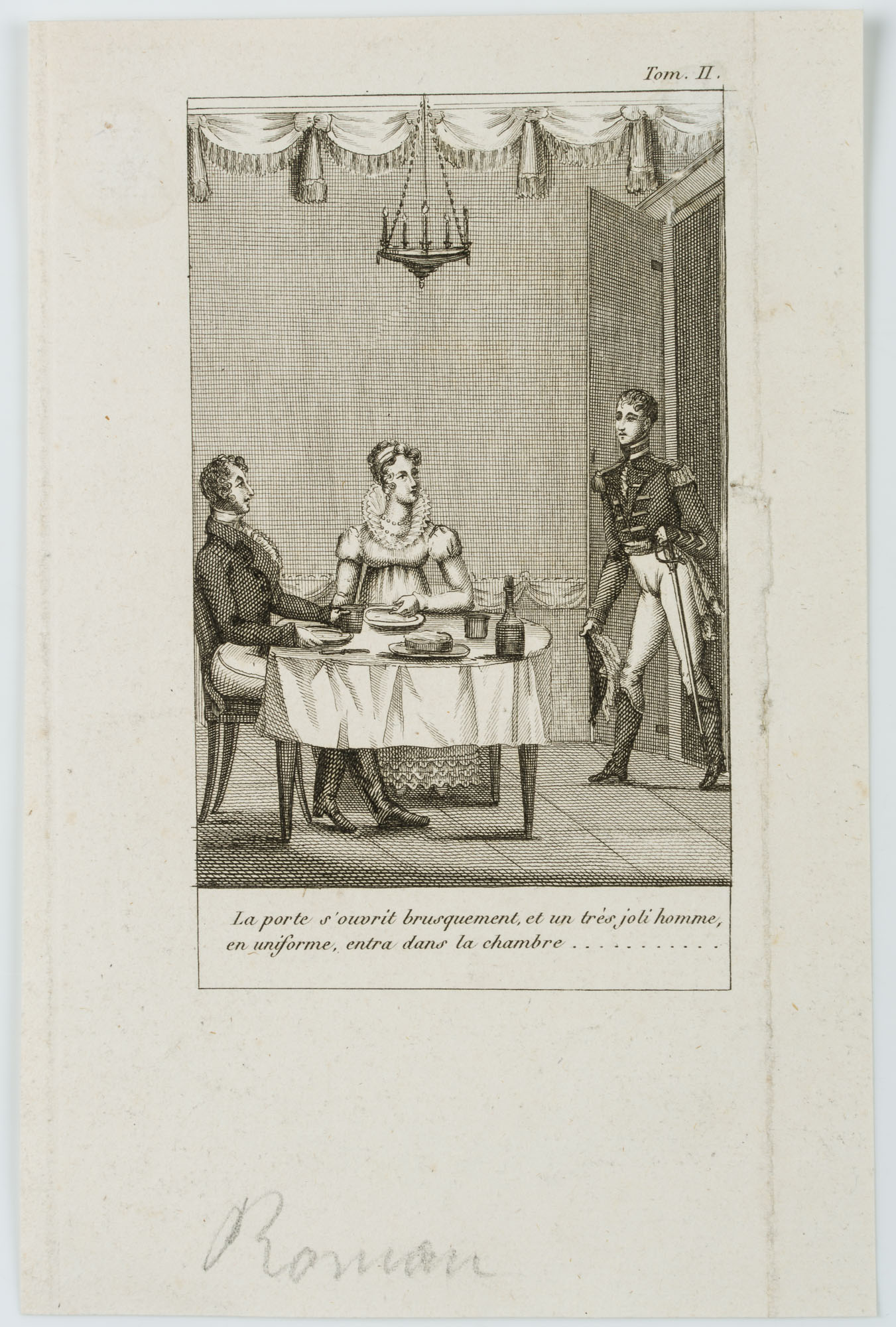 - Description: A uniformed young man enters a room where a smartly dressed couple is sitting at table. The print bears the caption: “La porte s’ouvrit brusquement, et un très joli homme, en uniforme, entra dans la chambre”.