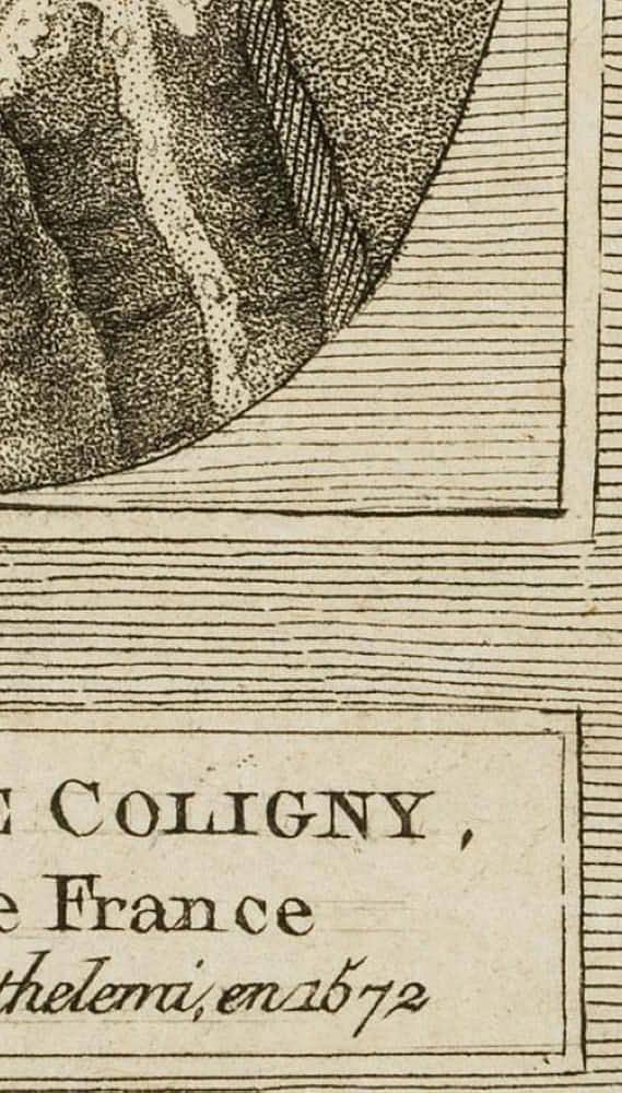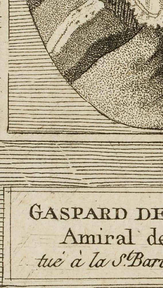 - Bezeichnung: Unterhalb des Bildes mit dem Namen des Dargestellten “GASPARD DE COLIGNY, Amiral de France” und Lebensangaben benannt.