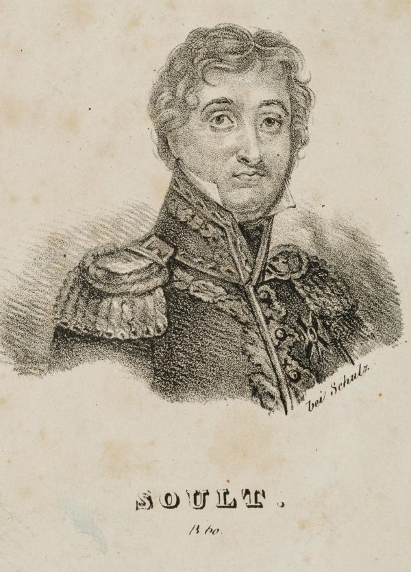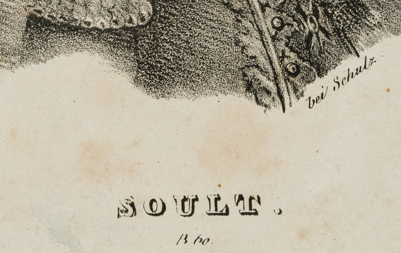 - Bezeichnung: Rechts unterhalb der Graphik signiert mit “bei Schulz”, darunter mit dem Namen des Dargestellten “SOULT” bezeichnet.