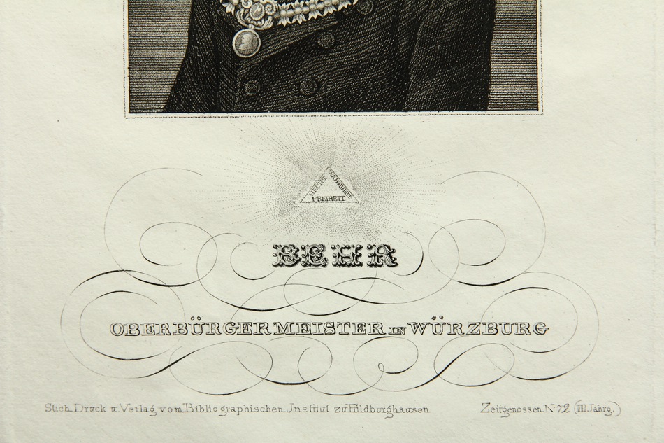 - Bezeichnung: Unterhalb der Darstellung in der Druckplatte kunstvoll mit dem Namen und Amt des Dargestellten bezeichnet. “Stich, Druck u. Verlag vom Bibliographischen Institut zu Hildburghausen”. Aus der Serie Zeitgenossen No 72 (III. Jahrg.).