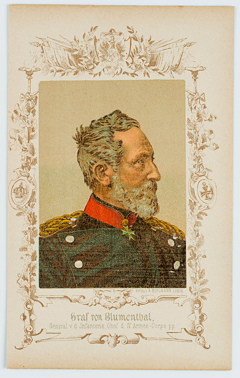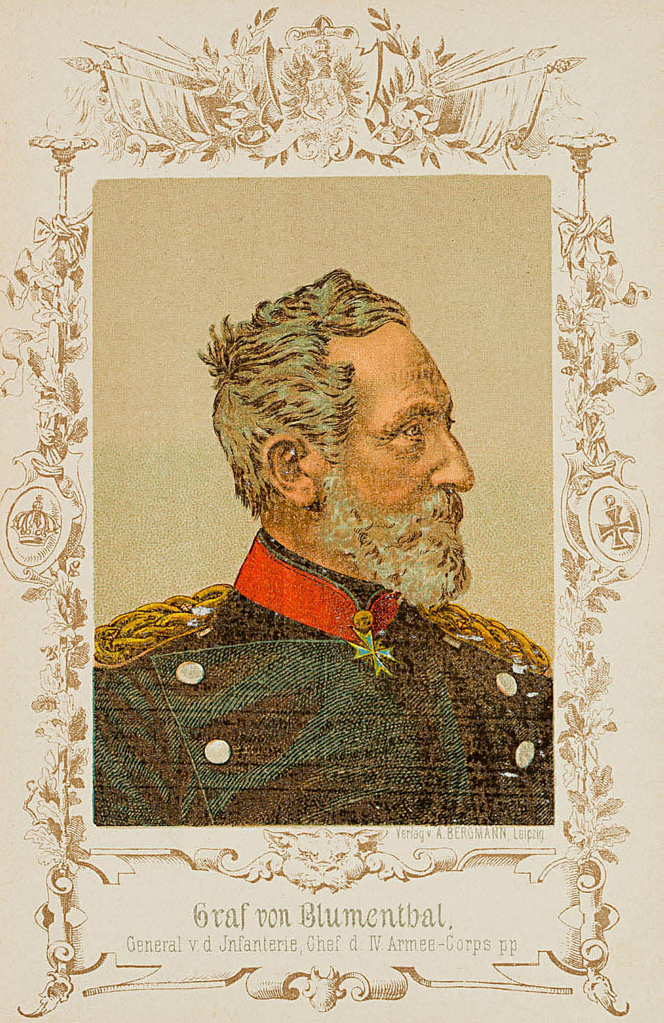 Unter dem Bild mit dem Namen und Angaben des Dargestellten “Graf von Blumenthal. General v. d. Infanterie, Chef d IV. Armee-Corps pp” bezeichnet.
